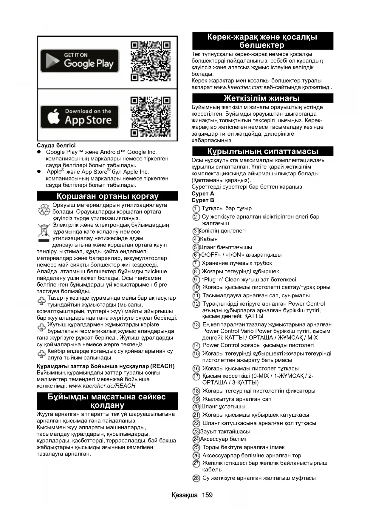 3 Көліктің дөңгелегі 4 Жабын 5 Шланг бағыттағышы 6 «0/OFF» / «I/ON» ажыратқышы 7 Хранение лучевых трубок 8 Жоғары тегеурінді құбыршек 9 *Plug ‘n’ Clean жуғыш зат бөтелкесі 10 Жоғары қысымды пистолетті сақтау/тұрақ орны 11 Тасымалдауға арналған сап, суырмалы 12 Тұрақты кірді кетіруге арналған Power Control ағынды құбырларға арналған бүріккіш түтігі, қысым деңгейі: ҚАТТЫ 13 Ең көп таралған тазалау жұмыстарына арналған Power Control Vario Power бүріккіш түтігі, қысым деңгейі: ҚАТТЫ / ОРТАША / ЖҰМСАҚ / MIX 14 Power Control жоғары қысымды пистолеті 15 Жоғары тегеурінді құбыршекті жоғары тегеурінді пистолеттен ажырату батырмасы 16 Жоғары қысымды пистолет тұтқасы 17 Қысым көрсеткіші (0-MIX / 1-ЖҰМСАҚ / 2- ОРТАША / 3-ҚАТТЫ) 18 Жоғары тегеурінді пистолеттің фиксаторы 19 Жылжытуға арналған сап 20 Шланг ұстағышы 21 Жоғары қысымды құбыршек катушкасы 22 Шланг катушкасына арналған қол тұтқасы 23 Зауыт тақтайшасы 24 Аксессуар бөлімі 25 Торды бекітуге арналған ілмек 26 Аксессуарлар бөліміне арналған тор 27 Желілік істікшесі бар желілік байланыстырғыш