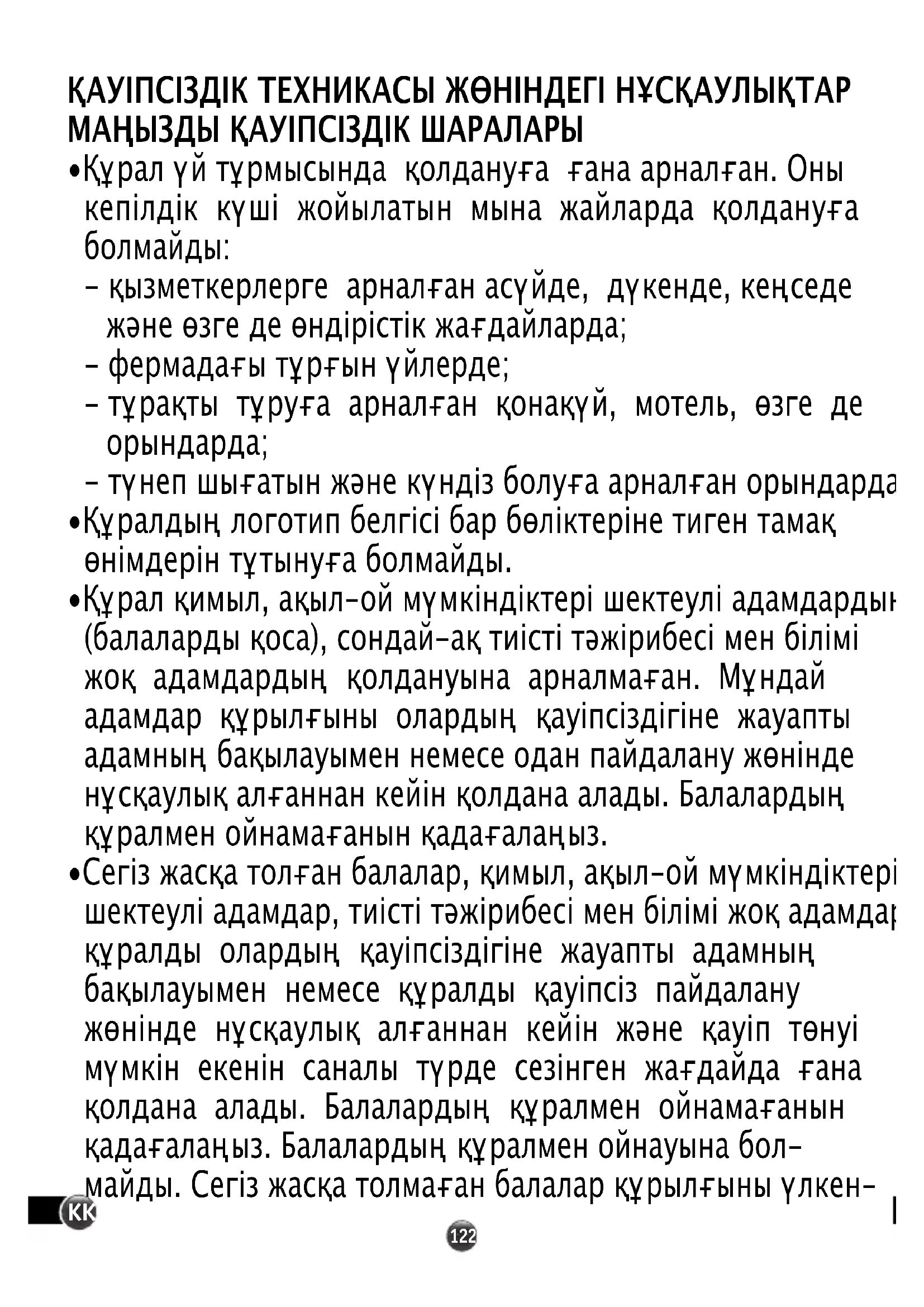 - Құрал қимыл, ақыл-ой мүмкіндіктері шектеулі адамдардың (балаларды қоса), сондай-ақ тиісті тәжірибесі мен білімі жоқ адамдардың қолдануына арналмаған. Мұндай адамдар құрылғыны олардың қауіпсіздігіне жауапты адамның бақылауымен немесе одан пайдалану жөнінде нұсқаулық алғаннан кейін қолдана алады. Балалардың құралмен ойнамағанын қадағалаңыз.