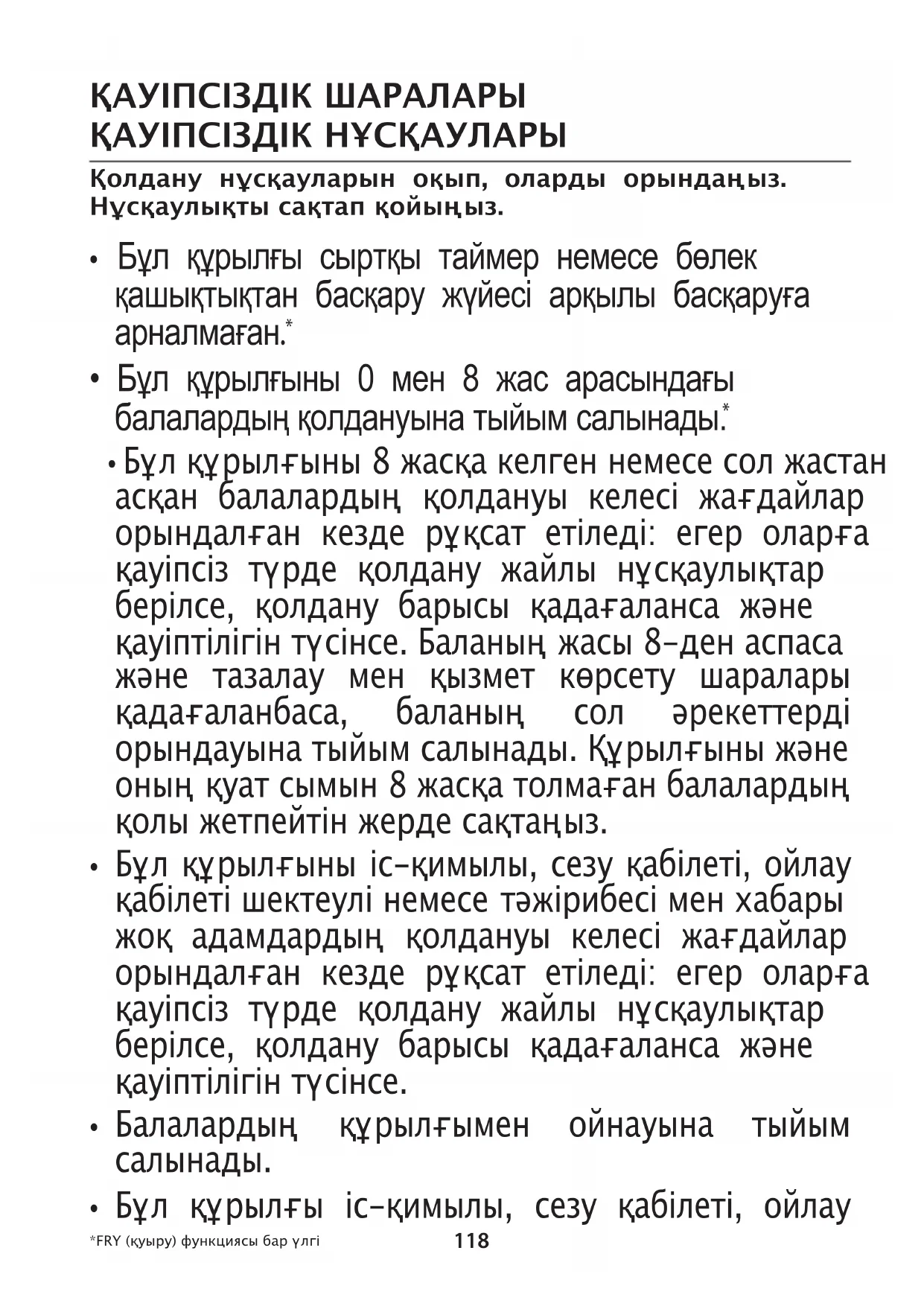 - Бұл құрылғыны іс-қимылы, сезу қабілеті, ойлау қабілеті шектеулі немесе тәжірибесі мен хабары жоқ адамдардың қолдануы келесі жағдайлар орындалған кезде рұқсат етіледі: егер оларға қауіпсіз түрде қолдану жайлы нұсқаулықтар берілсе, қолдану барысы қадағаланса және қауіптілігін түсінсе.