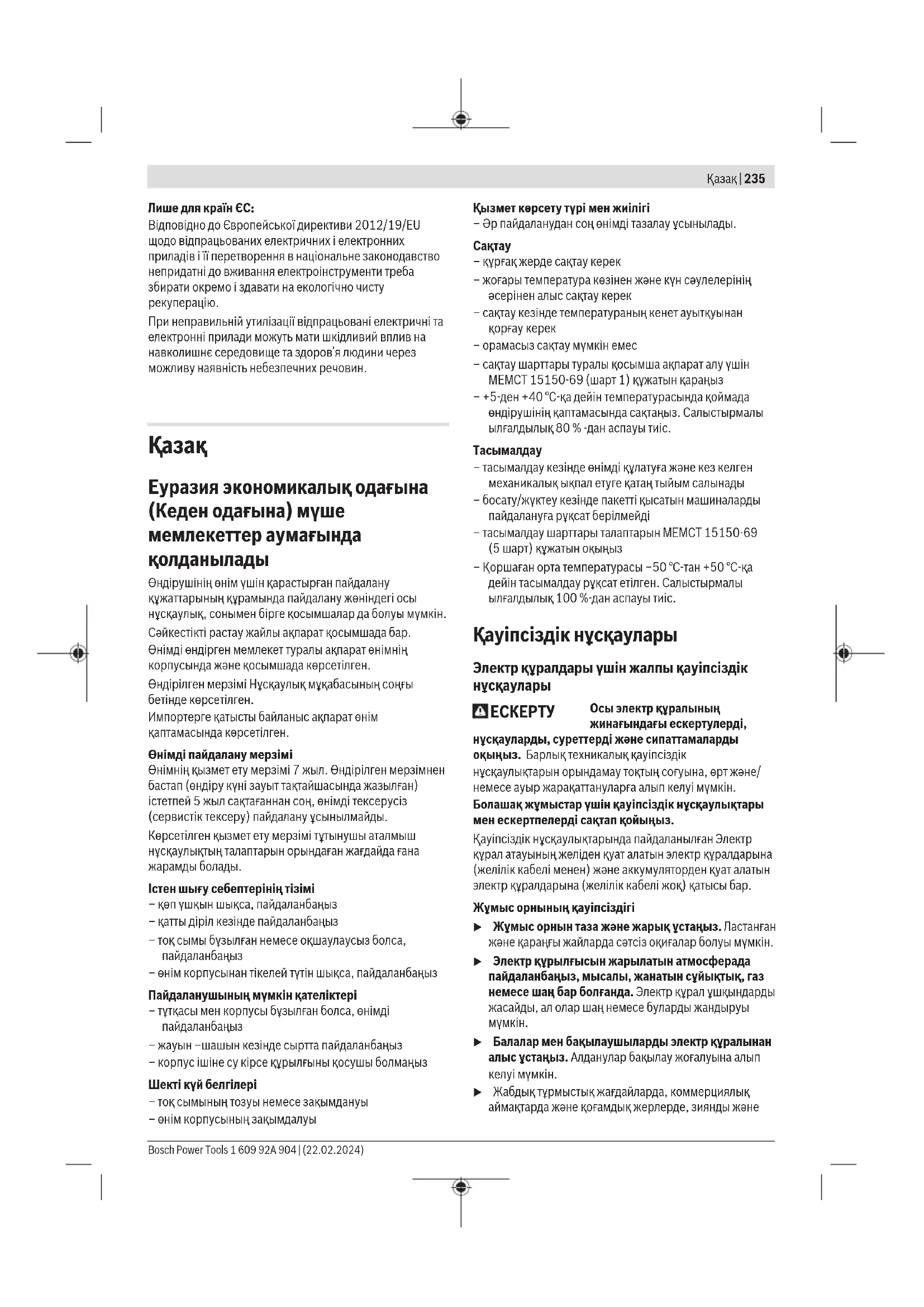 u Балалар мен бақылаушыларды электр құралынан алыс ұстаңыз. Алданулар бақылау жоғалуына алып келуі мүмкін. u Жабдық тұрмыстық жағдайларда, коммерциялық аймақтарда және қоғамдық жерлерде, зиянды және Bosch Power Tools 1 609 92A 904 | (22.02.2024)236 | Қазақ қауіпті өндірістік факторлар жоқ кіші электр тұтынуы бар өндірістік аймақтарында жұмыс істеу үшін