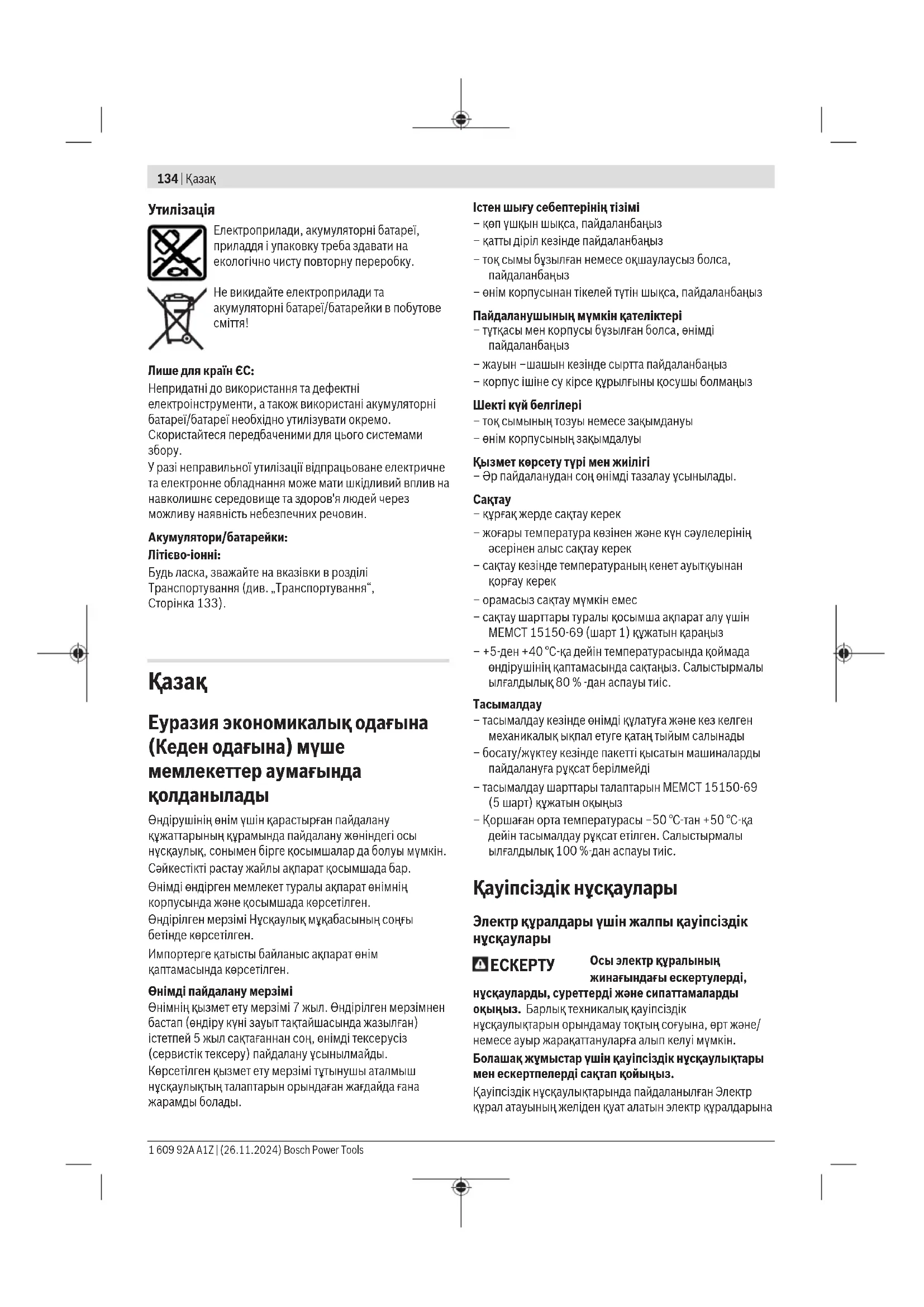 Осы электр құралының жинағындағы ескертулерді, нұсқауларды, суреттерді және сипаттамаларды оқыңыз. Барлық техникалық қауіпсіздік нұсқаулықтарын орындамау тоқтың соғуына, өрт және/ немесе ауыр жарақаттануларға алып келуі мүмкін. Болашақ жұмыстар үшін қауіпсіздік нұсқаулықтары мен ескертпелерді сақтап қойыңыз. Қауіпсіздік нұсқаулықтарында пайдаланылған Электр құрал атауының желіден қуат алатын электр құралдарына 1 609 92A A1Z | (26.11.2024) Bosch Power ToolsҚазақ | 135 (желілік кабелі менен) және аккумуляторден қуат алатын электр құралдарына (желілік кабелі жоқ) қатысы бар. Жұмыс орнының қауіпсіздігі u Жұмыс орнын таза және жарық ұстаңыз. Ластанған және қараңғы жайларда сәтсіз оқиғалар болуы мүмкін. u Электр құрылғысын жарылатын атмосферада пайдаланбаңыз, мысалы, жанатын сұйықтық, газ немесе шаң бар болғанда. Электр құрал ұшқындарды жасайды, ал олар шаң немесе буларды жандыруы