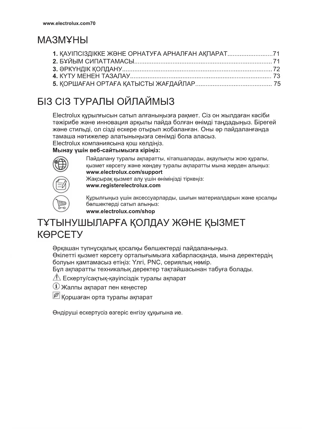 Әрқашан түпнұсқалық қосалқы бөлшектерді пайдаланыңыз. Өкілетті қызмет көрсету орталығымызға хабарласқанда, мына деректердің болуын қамтамасыз етіңіз: Үлгі, PNC, сериялық нөмір. Бұл ақпаратты техникалық деректер тақтайшасынан табуға болады. Ескерту/сақтық-қауіпсіздік туралы ақпарат Жалпы ақпарат пен кеңестер Қоршаған орта туралы ақпарат Өндіруші ескертусіз өзгеріс енгізу құқығына ие. www.electrolux.com701. ҚАУІПСІЗДІККЕ ЖӘНЕ ОРНАТУҒА АРНАЛҒАН