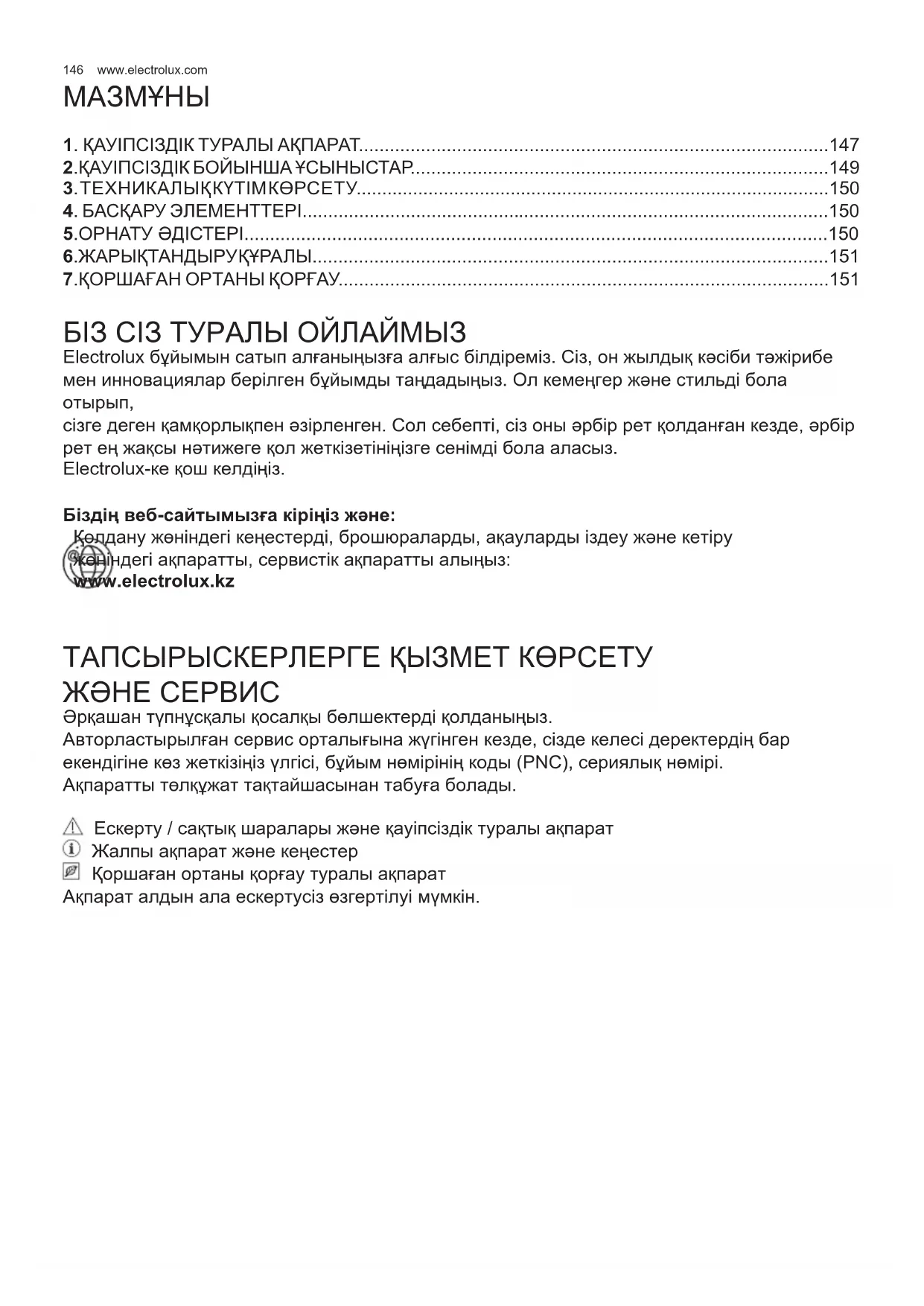 сізге деген қамқорлықпен əзірленген. Сол себепті, сіз оны əрбір рет қолданған кезде, əрбір рет ең жақсы нəтижеге қол жеткізетініңізге сенімді бола аласыз. Electrolux-ке қош келдіңіз. Біздің веб-сайтымызға кіріңіз жəне: Қолдану жөніндегі кеңестерді, брошюраларды, ақауларды іздеу жəне кетіру жөніндегі ақпаратты, сервистік ақпаратты алыңыз: www.electrolux.kz