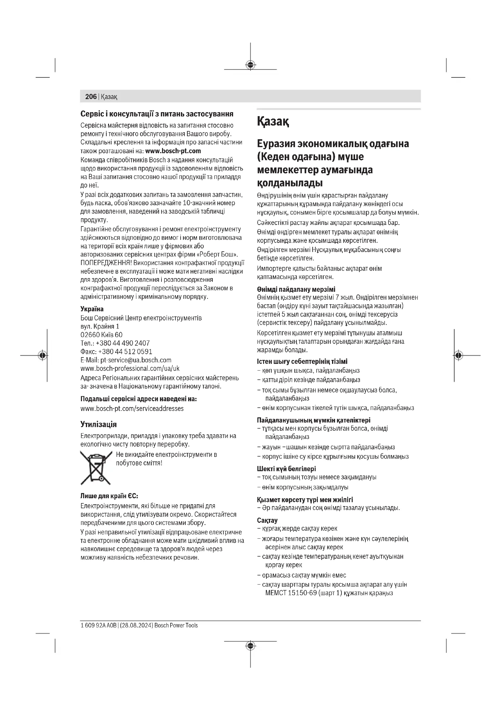 – барлық электр құралдарындағыдай электр құралының қалыпты тозуы. Bosch Power Tools 1 609 92A A0B | (28.08.2024)218 | Română Жалғағыш контактілер, сымдар, қылшақтар және т.б. сияқты құрал бөліктерінің қызмет ету мерзімін қысқартатын қалыпты тозу нәтижесінде қажеттілігі туындаған жөндеу кепілдік аясына кірмейді: – табиғи тозу (ресурстың толық пайдаланылуы); – қате орнату, рұқсатсыз модификациялау, қате қолдану, қызмет көрсету немесе сақтау ережелерін бұзу нәтижесінде істен шыққан жабдық пен оның