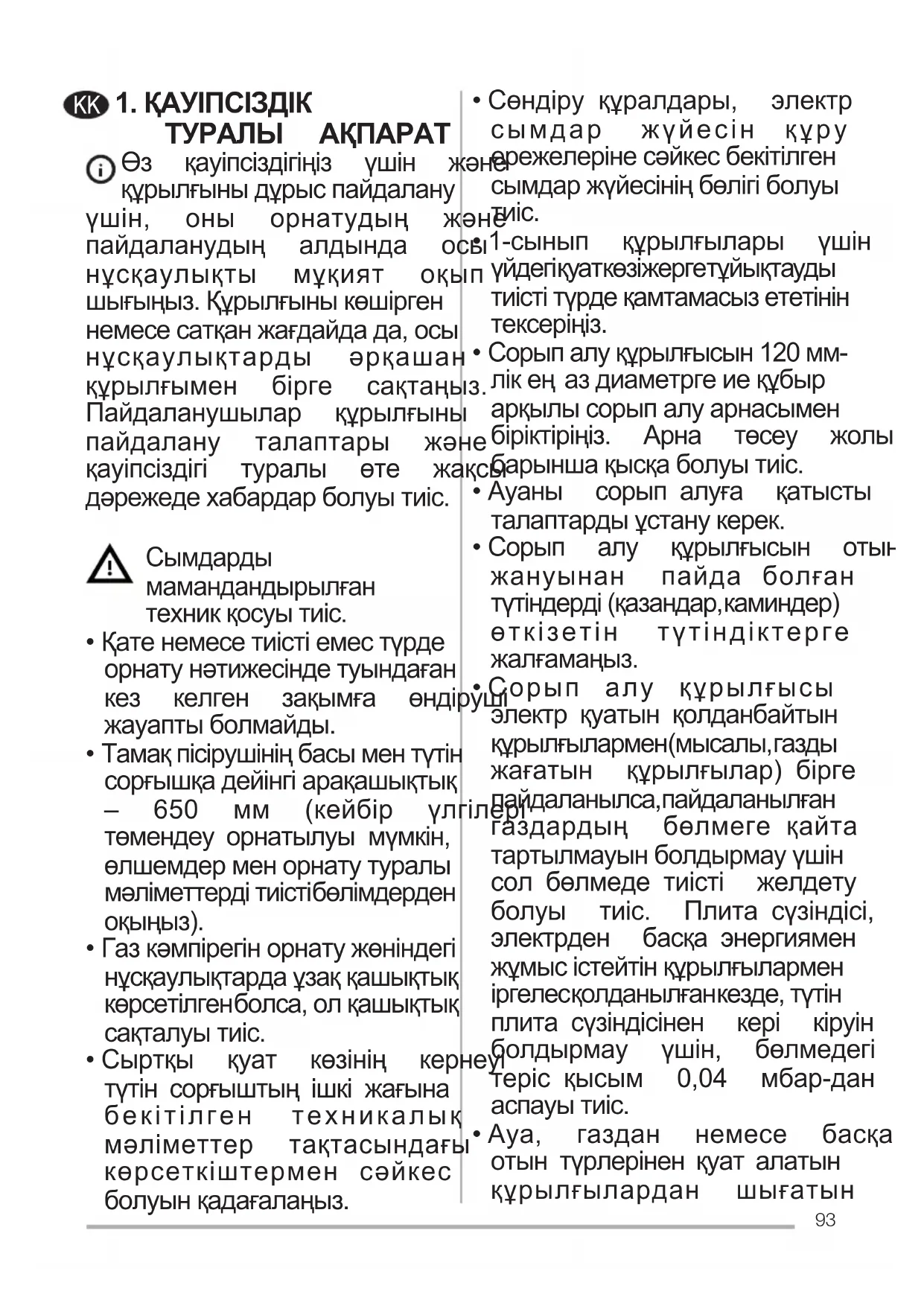 - Сорып алу құрылғысы электр қуатын қолданбайтын құрылғылармен(мысалы,газды жағатын құрылғылар) бірге пайдаланылса,пайдаланылған газдардың бөлмеге қайта тартылмауынболдырмауүшін сол бөлмеде тиісті желдету болуы тиіс. Плита сүзіндісі, электрден басқа энергиямен жұмысістейтінқұрылғылармен іргелесқолданылғанкезде,түтін плита сүзіндісінен кері кіруін болдырмау үшін, бөлмедегі теріс қысым 0,04 мбар-дан аспауытиіс.