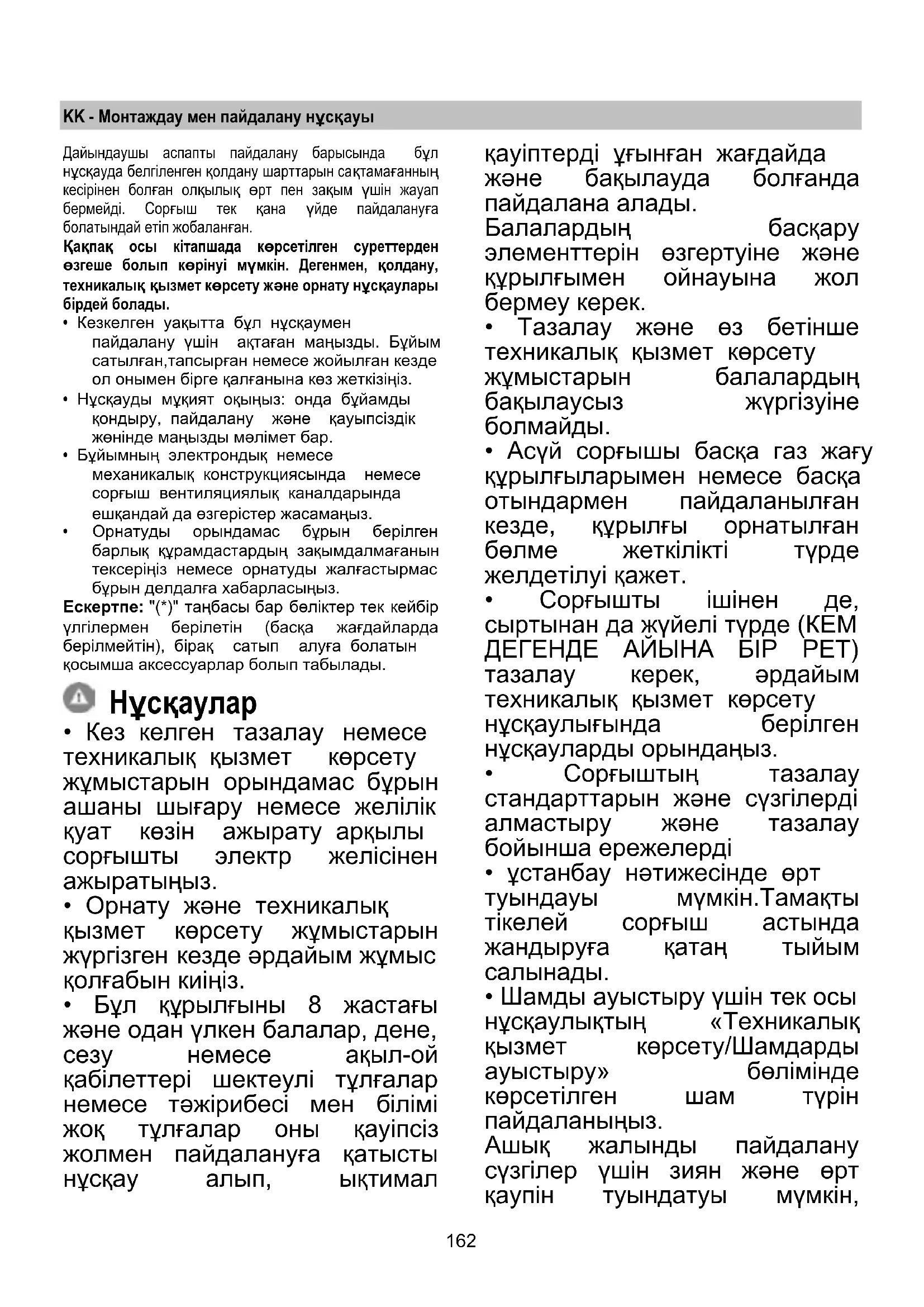 - Бұл құрылғыны 8 жастағы және одан үлкен балалар, дене, сезу немесе ақыл-ой қабілеттері шектеулі тұлғалар немесе тәжірибесі мен білімі жоқ тұлғалар оны қауіпсіз жолмен пайдалануға қатысты нұсқау алып, ықтимал қауіптерді ұғынған жағдайда және бақылауда болғанда пайдалана алады. Балалардың басқару элементтерін өзгертуіне және құрылғымен ойнауына жол бермеу керек.