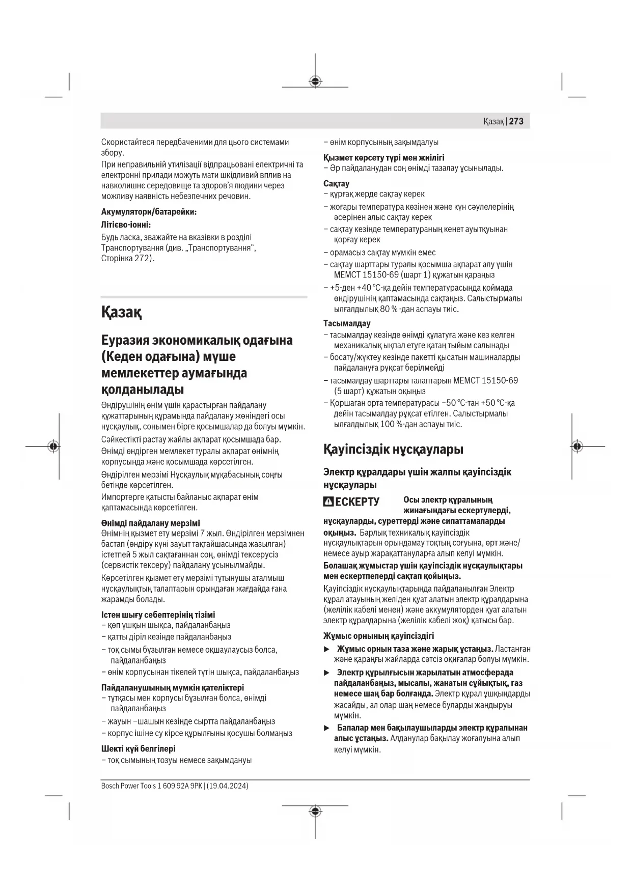 u Балалар мен бақылаушыларды электр құралынан алыс ұстаңыз. Алданулар бақылау жоғалуына алып келуі мүмкін. Bosch Power Tools 1 609 92A 9PK | (19.04.2024)274 | Қазақ u Жабдық тұрмыстық жағдайларда, коммерциялық аймақтарда және қоғамдық жерлерде, зиянды және қауіпті өндірістік факторлар жоқ кіші электр тұтынуы бар өндірістік аймақтарында жұмыс істеу үшін