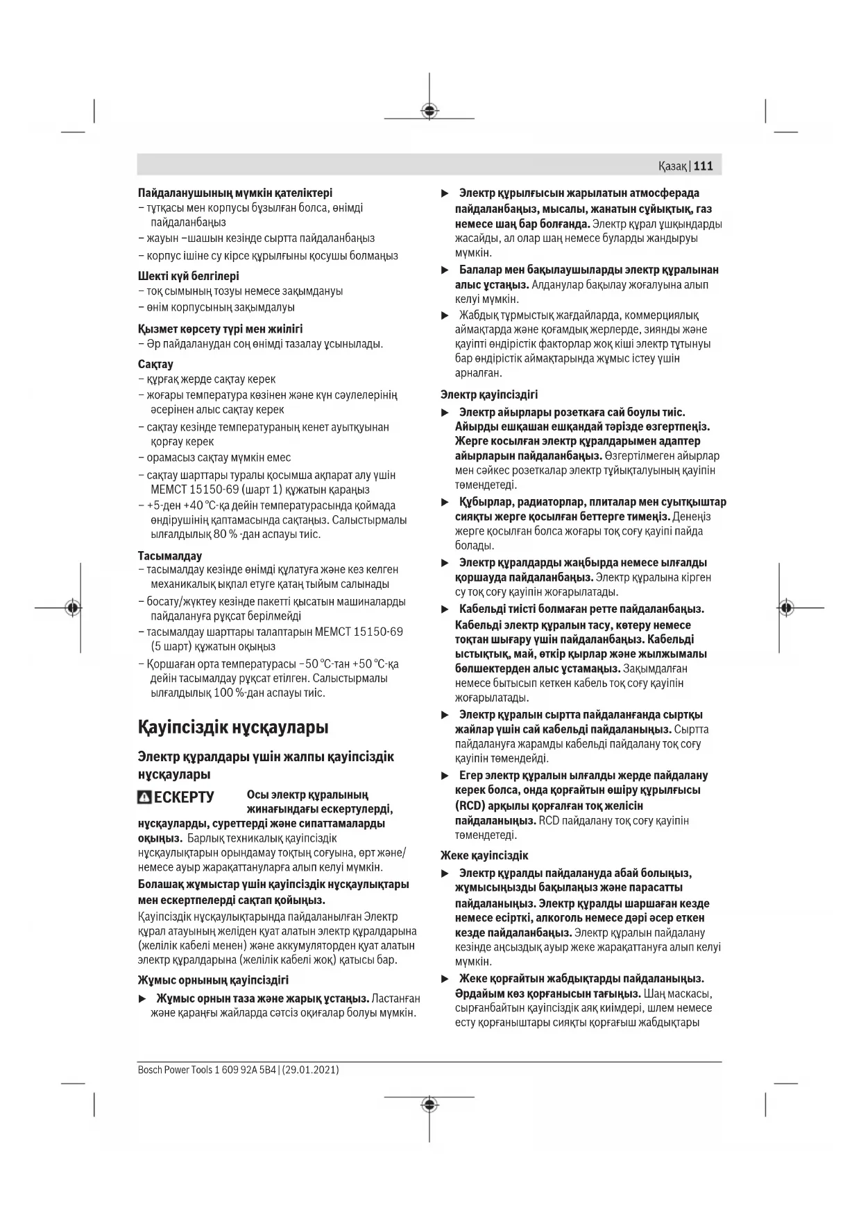 Еуразия экономикалық одағына (Кеден одағына) мүше мемлекеттер аумағында қолданылады Өндірушінің өнім үшін қарастырған пайдалану құжаттарының құрамында пайдалану жөніндегі осы нұсқаулық, сонымен бірге қосымшалар да болуы мүмкін. Сəйкестікті растау жайлы ақпарат қосымшада бар. Өнімді өндірген мемлекет туралы ақпарат өнімнің корпусында жəне қосымшада көрсетілген. Өндірілген мерзімі Нұсқаулық мұқабасының соңғы бетінде көрсетілген. Импортерге қатысты байланыс ақпарат өнім қаптамасында көрсетілген. Өнімді пайдалану мерзімі Өнімнің қызмет ету мерзімі 7жыл. Өндірілген мерзімнен бастап (өндіру күні зауыт тақтайшасында жазылған) істетпей 5жыл сақтағаннан соң, өнімді тексерусіз (сервистік тексеру) пайдалану ұсынылмайды. Көрсетілген қызмет ету мерзімі тұтынушы аталмыш нұсқаулықтың талаптарын орындаған жағдайда ғана жарамды болады. Iстен шығу себептерінің тізімі – қөп үшқын шықса, пайдаланбаңыз – қатты діріл кезінде пайдаланбаңыз – тоқ сымы бұзылған немесе оқшаулаусыз болса, пайдаланбаңыз – өнім корпусынан тікелей түтін шықса, пайдаланбаңыз 1 609 92A 5B4 | (29.01.2021) Bosch Power ToolsҚазақ | 111 Пайдаланушының мүмкін қателіктері – тұтқасы мен корпусы бұзылған болса, өнімді пайдаланбаңыз – жауын –шашын кезінде сыртта пайдаланбаңыз – корпус ішіне су кірсе құрылғыны қосушы болмаңыз Шекті күй белгілері – тоқ сымының тозуы немесе зақымдануы – өнім корпусының зақымдалуы Қызмет көрсету түрі мен жиілігі – Әр пайдаланудан соң өнімді тазалау ұсынылады.