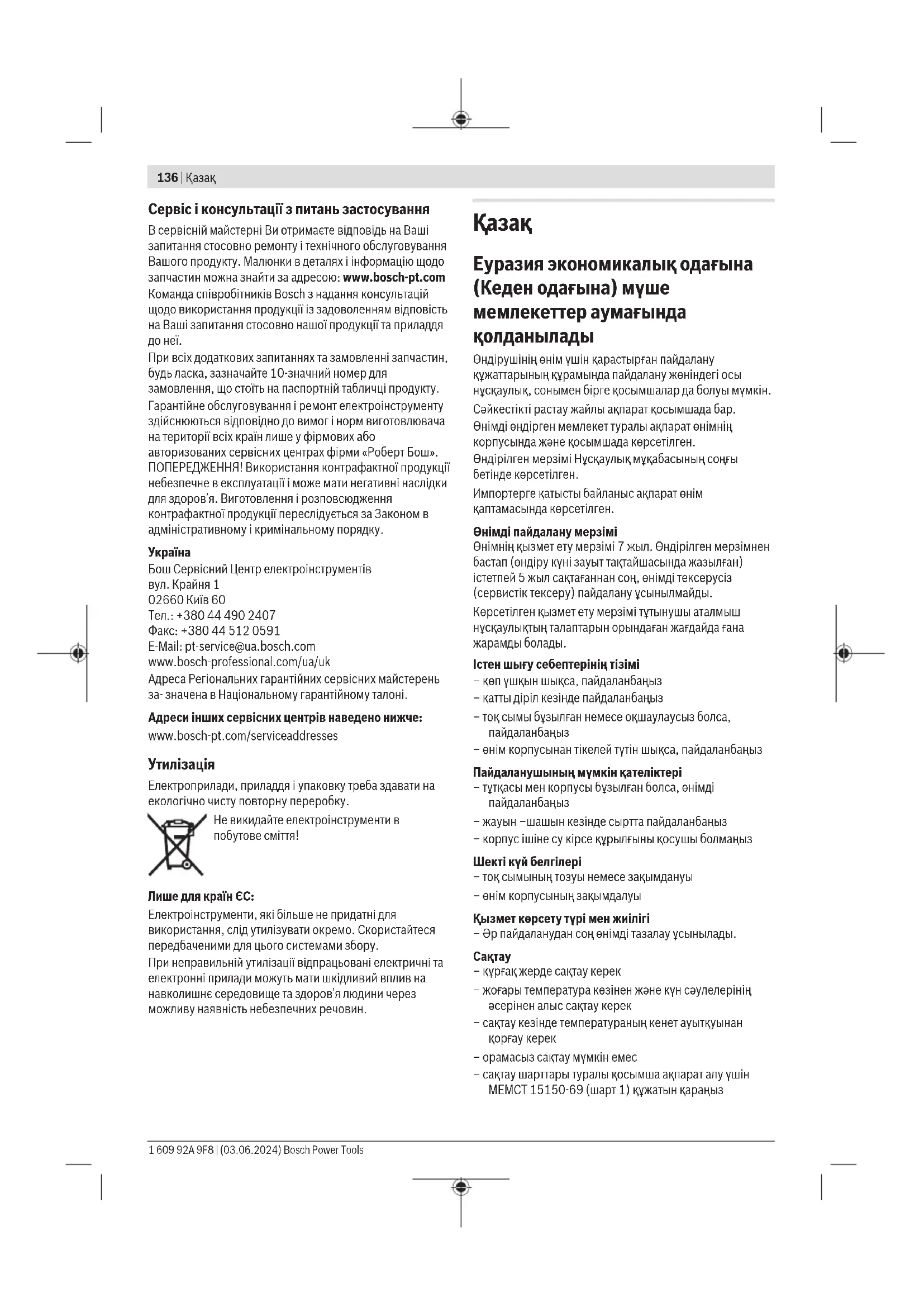 Сұрақтар қою және қосалқы бөлшектерге тапсырыс беру кезінде міндетті түрде өнімнің фирмалық тақтайшасындағы 10 таңбалы өнім нөмірін беріңіз. Өндіруші талаптары мен нормаларының сақталуымен электр құралын жөндеу және кепілді қызмет көрсету барлық мемлекеттер аумағында тек “Роберт Бош” фирмалық немесе авторизацияланған қызмет көрсету орталықтарында орындалады. ЕСКЕРТУ! Заңсыз жолмен әкелінген өнімдерді пайдалану қауіпті, денсаулығыңызға зиян келтіруі мүмкін. Өнімдерді заңсыз жасау және тарату әкімшілік және қылмыстық тәртіп бойынша Заңмен қудаланады.