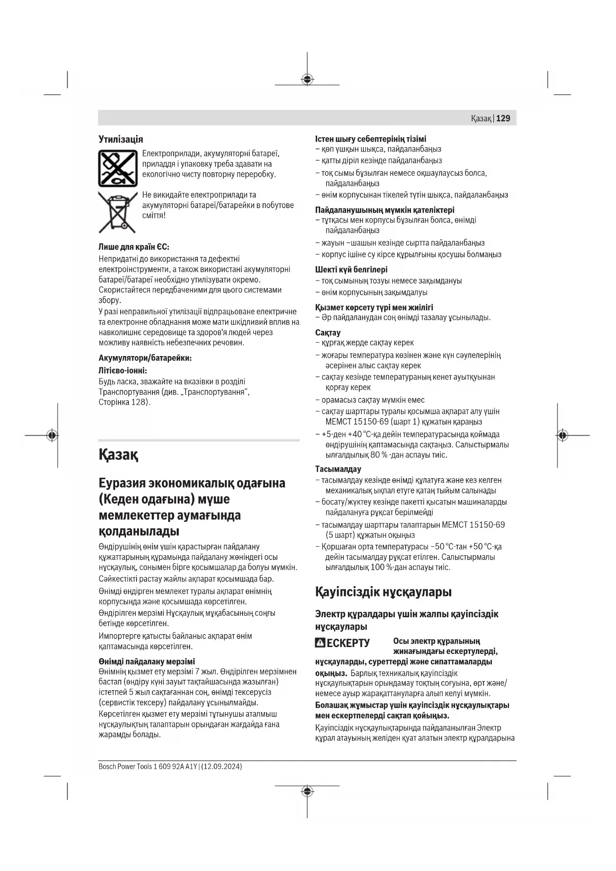 Осы электр құралының жинағындағы ескертулерді, нұсқауларды, суреттерді және сипаттамаларды оқыңыз. Барлық техникалық қауіпсіздік нұсқаулықтарын орындамау тоқтың соғуына, өрт және/ немесе ауыр жарақаттануларға алып келуі мүмкін. Болашақ жұмыстар үшін қауіпсіздік нұсқаулықтары мен ескертпелерді сақтап қойыңыз. Қауіпсіздік нұсқаулықтарында пайдаланылған Электр құрал атауының желіден қуат алатын электр құралдарына Bosch Power Tools 1 609 92A A1Y | (12.09.2024)130 | Қазақ (желілік кабелі менен) және аккумуляторден қуат алатын электр құралдарына (желілік кабелі жоқ) қатысы бар. Жұмыс орнының қауіпсіздігі u Жұмыс орнын таза және жарық ұстаңыз. Ластанған және қараңғы жайларда сәтсіз оқиғалар болуы мүмкін. u Электр құрылғысын жарылатын атмосферада пайдаланбаңыз, мысалы, жанатын сұйықтық, газ немесе шаң бар болғанда. Электр құрал ұшқындарды жасайды, ал олар шаң немесе буларды жандыруы