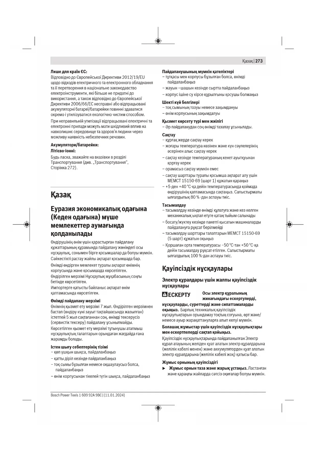 Осы электр құралының жинағындағы ескертулерді, нұсқауларды, суреттерді және сипаттамаларды оқыңыз. Барлық техникалық қауіпсіздік нұсқаулықтарын орындамау тоқтың соғуына, өрт және/ немесе ауыр жарақаттануларға алып келуі мүмкін. Болашақ жұмыстар үшін қауіпсіздік нұсқаулықтары мен ескертпелерді сақтап қойыңыз. Қауіпсіздік нұсқаулықтарында пайдаланылған Электр құрал атауының желіден қуат алатын электр құралдарына (желілік кабелі менен) және аккумуляторден қуат алатын электр құралдарына (желілік кабелі жоқ) қатысы бар. Жұмыс орнының қауіпсіздігі u Жұмыс орнын таза және жарық ұстаңыз. Ластанған және қараңғы жайларда сәтсіз оқиғалар болуы мүмкін. Bosch Power Tools 1 609 92A 9BC | (11.01.2024)274 | Қазақ u Электр құрылғысын жарылатын атмосферада пайдаланбаңыз, мысалы, жанатын сұйықтық, газ немесе шаң бар болғанда. Электр құрал ұшқындарды жасайды, ал олар шаң немесе буларды жандыруы