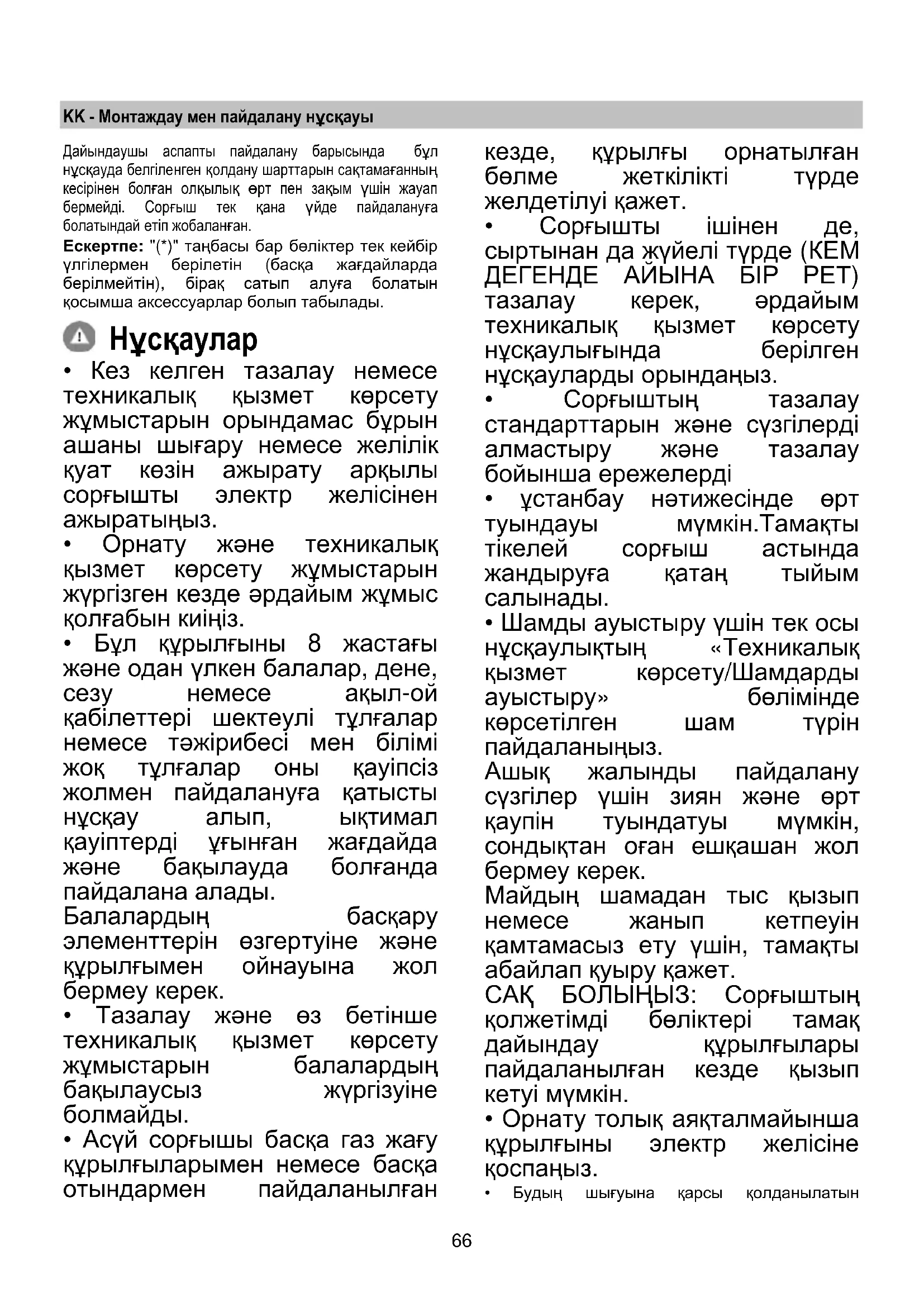 - Бұл құрылғыны 8 жастағы жəне одан үлкен балалар, дене, сезу немесе ақыл-ой қабілеттері шектеулі тұлғалар немесе тəжірибесі мен білімі жоқ тұлғалар оны қауіпсіз жолмен пайдалануға қатысты нұсқау алып, ықтимал қауіптерді ұғынған жағдайда жəне бақылауда болғанда пайдалана алады. Балалардың басқару элементтерін өзгертуіне жəне құрылғымен ойнауына жол бермеу керек.