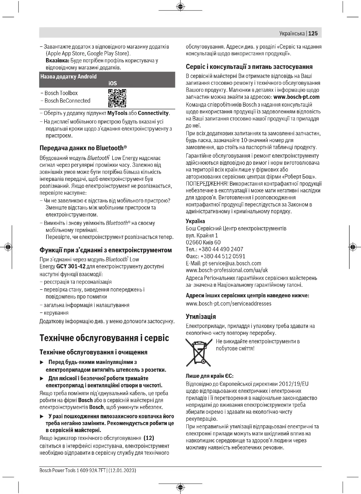 Техникалық күтім және қызмет Техникалық қызмет көрсету және тазалау u Барлық жұмыстардан алдын электр құралының желілік айырын розеткадан шығарыңыз. u Жақсы әрі сенімді жұмыс істеу үшін электр құралы мен желдеткіш тесікті таза ұстаңыз. Егер байланыс сымын алмастыру қажет болса, қауіпсіздіктің төмендеуіне жол бермеу үшін осы жұмыс тек Bosch компаниясы немесе Bosch электр құралдары бойынша өкілетті қызмет көрсету орталықтарында жүргізілуі тиіс. u Зақымдалған шаңнан қорғайтын қаптаманы дереу ауыстыру керек. Оны қызмет көрсету орталығында орындауға кеңес беріледі. Техникалық қызмет көрсету индикаторы(12) пайдаланушы интерфейсінде жанып тұрса, электр құралын қызмет көрсету орталығына техникалық қызмет 1 609 92A 7FT | (12.01.2023) Bosch Power ToolsҚазақ | 133 көрсету үшін жіберу қажет. Жазбаларды "Қызмет көрсету орталығы және пайдалану бойынша кеңес алу" бөлімінен
