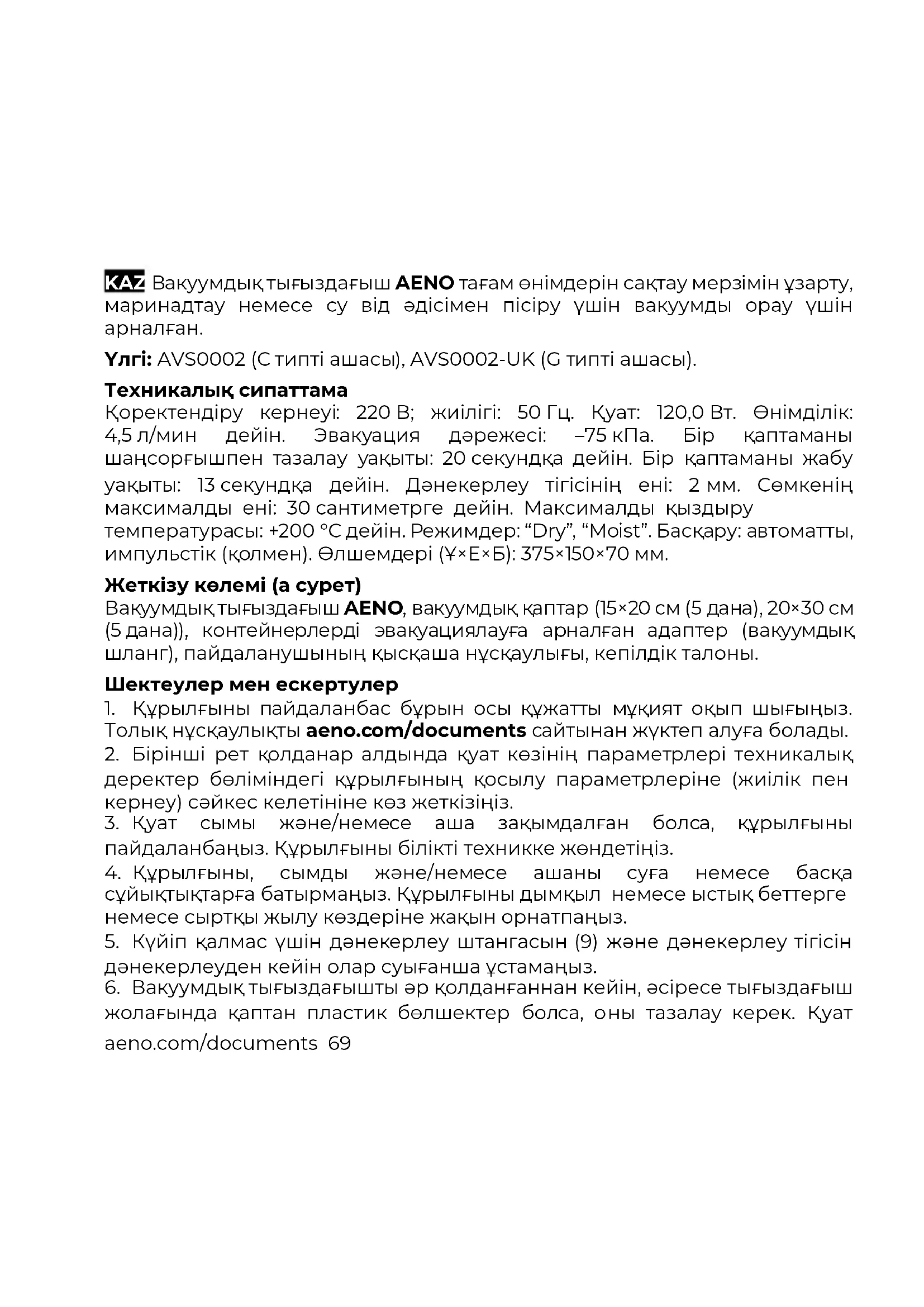 Үлгі: AVS0002 (C типті ашасы), AVS0002-UK (G типті ашасы). Техникалық сипаттама Қоректендіру кернеуі: 220 В; жиілігі: 50 Гц. Қуат: 120,0 Вт. Өнімділік: 4,5 л/мин дейін. Эвакуация дәрежесі: –75 кПа. Бір қаптаманы шаңсорғышпен тазалау уақыты: 20 секундқа дейін. Бір қаптаманы жабу уақыты: 13 секундқа дейін. Дәнекерлеу тігісінің ені: 2 мм. Сөмкенің максималды ені: 30 сантиметрге дейін. Максималды қыздыру температурасы: +200 °C дейін. Режимдер: “Dry”, “Moist”. Басқару: автоматты, импульстік (қолмен). Өлшемдері (Ұ×Е×Б): 375×150×70 мм. Жеткізу көлемі (а сурет) Вакуумдық тығыздағыш AENO, вакуумдық қаптар (15×20 см (5 дана), 20×30 см (5 дана)), контейнерлерді эвакуациялауға арналған адаптер (вакуумдық шланг), пайдаланушының қысқаша нұсқаулығы, кепілдік талоны. Шектеулер мен ескертулер
