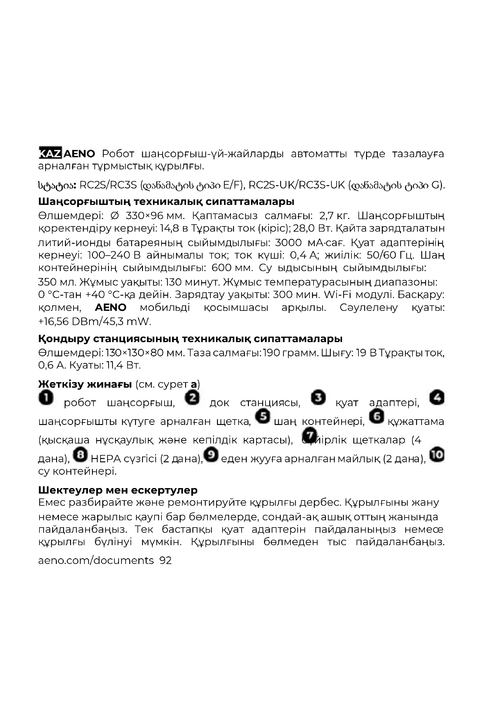 RC3S - робот шаңсорғыш AENO - Тегін пайдаланушы нұсқаулығы