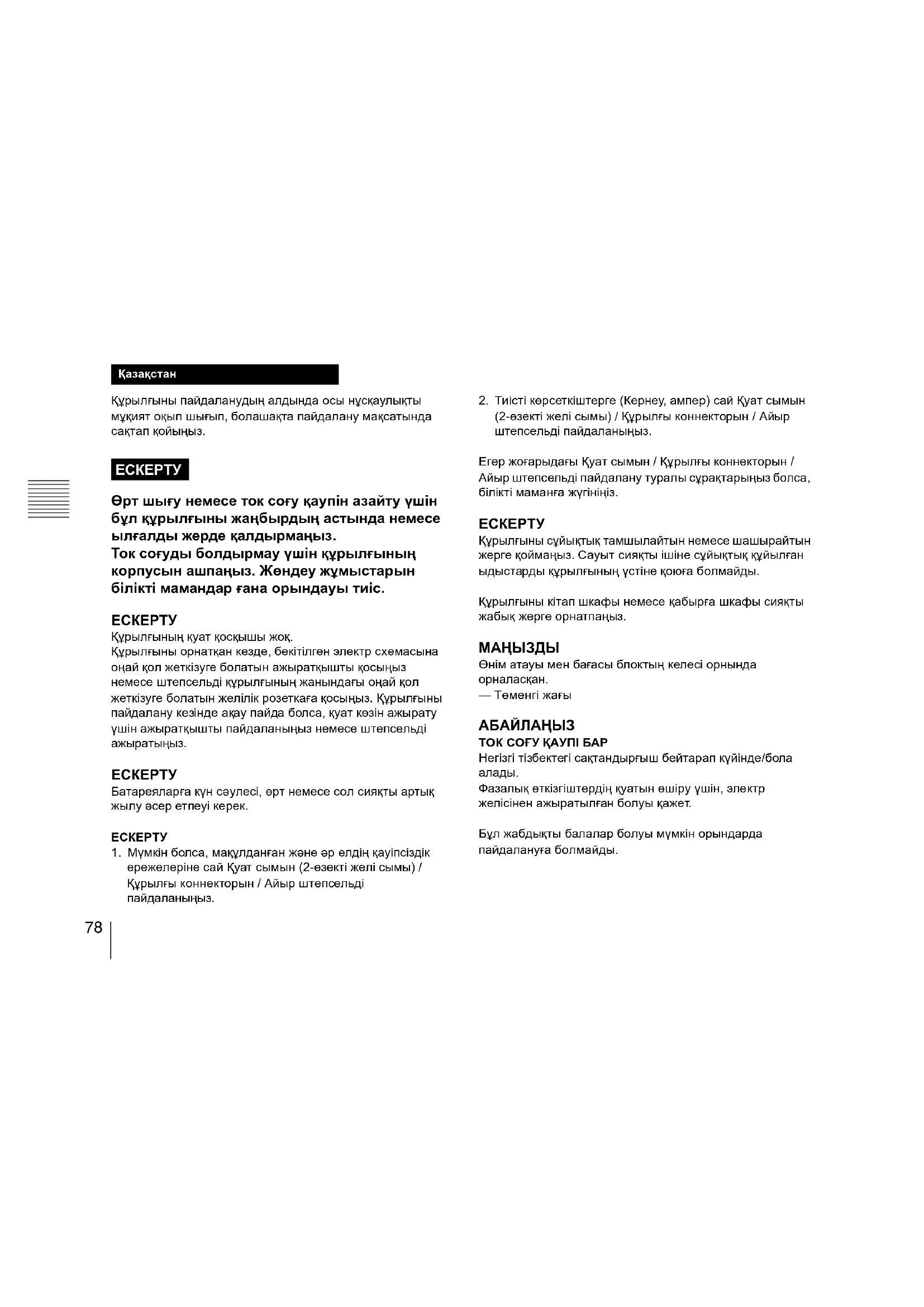 Рекомендуется проводить периодические осмотры для обеспечения должной работы устройства и увеличения срока его службы. Для получения дополнительных сведений об осмотрах обратитесь к представителю службы технического обслуживания или отдела продаж компании Sony.78 Құрылғыны пайдаланудың алдында осы нұсқаулықты мұқият оқып шығып, болашақта пайдалану мақсатында сақтап қойыңыз. Өрт шығу немесе ток соғу қаупін азайту үшін бұл құрылғыны жаңбырдың астында немесе ылғалды жерде қалдырмаңыз. Ток соғуды болдырмау үшін құрылғының корпусын ашпаңыз. Жөндеу жұмыстарын білікті мамандар ғана орындауы тиіс.