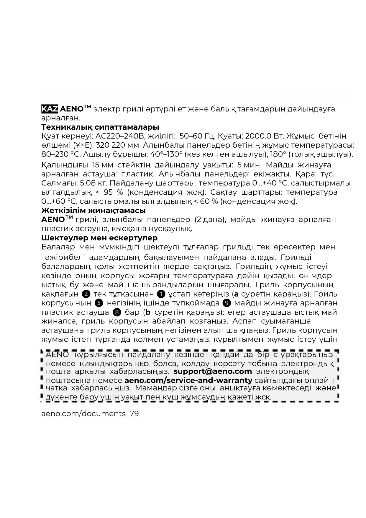 немесе қиындықтарыңыз болса, қолдау көрсету тобына электрондық пошта арқылы хабарласыңыз. support@aeno.com электрондық поштасына немесе aeno.com/service-and-warranty сайтындағы онлайн чатқа хабарласыңыз. Мамандар сізге оны анықтауға көмектеседі және