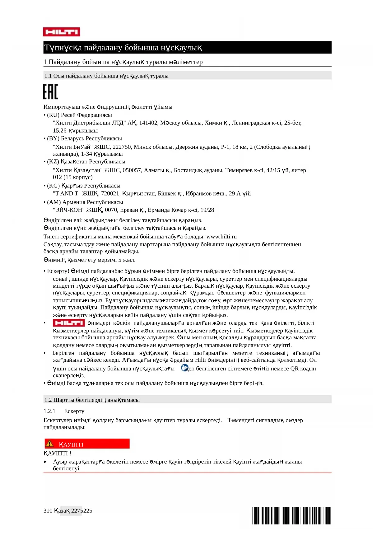- (AM) Армения Республикасы "ЭЙЧ-КОН" ЖШҚ, 0070, Ереван қ., Ерманда Кочар к-сі, 19/28 Өндірілген елі: жабдықтағы белгілеу тақтайшасын қараңыз. Өндірілген күні: жабдықтағы белгілеу тақтайшасын қараңыз. Тиісті сертификатты мына мекенжай бойынша табуға болады: www.hilti.ru Сақтау, тасымалдау және пайдалану шарттарына пайдалану бойынша нұсқаулықта белгіленгеннен басқа арнайы талаптар қойылмайды. Өнімнің қызмет ету мерзімі 5 жыл.