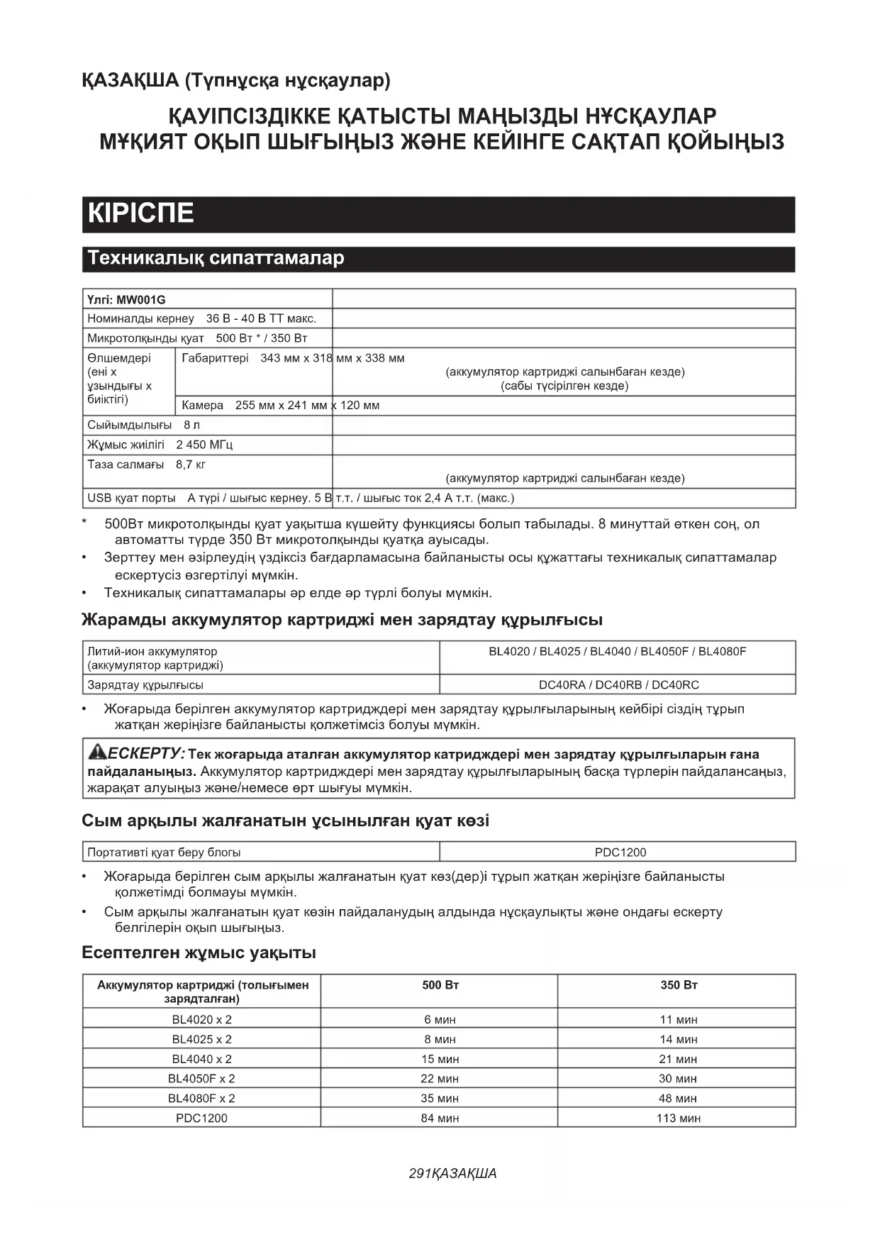 Техникалық сипаттамалар Үлгі: MW001GНоминалдыкернеу 36В-40ВТТмакс.Микротолқындықуат 500Вт*/350ВтӨлшемдері(еніxұзындығыxбиіктігі)Габариттері 343ммx318ммx338мм(аккумуляторкартриджісалынбағанкезде)(сабытүсірілгенкезде)Камера 255ммx241ммx120ммСыйымдылығы 8лЖұмысжиілігі 2450МГцТазасалмағы 8,7кг(аккумуляторкартриджісалынбағанкезде)USBқуатпорты Aтүрі/шығыскернеу.5Вт.т./шығысток2,4Ат.т.(макс.)* 500Втмикротолқындықуатуақытшакүшейтуфункциясыболыптабылады.8минуттайөткенсоң,олавтоматтытүрде350Втмикротолқындықуатқаауысады.• Зерттеуменәзірлеудіңүздіксізбағдарламасынабайланыстыосықұжаттағытехникалықсипаттамаларескертусізөзгертілуімүмкін.• Техникалықсипаттамаларыәрелдеәртүрліболуымүмкін. Жарамды аккумулятор картриджі мен зарядтау құрылғысы Литий-ионаккумулятор(аккумуляторкартриджі)BL4020 / BL4025 / BL4040 / BL4050F / BL4080FЗарядтауқұрылғысы DC40RA / DC40RB / DC40RC• Жоғарыдаберілгенаккумуляторкартридждерімензарядтауқұрылғыларыныңкейбірісіздіңтұрыпжатқанжеріңізгебайланыстықолжетімсізболуымүмкін. ЕСКЕРТУ: Тек жоғарыда аталған аккумулятор катридждері мен зарядтау құрылғыларын ғана пайдаланыңыз.Аккумуляторкартридждерімензарядтауқұрылғыларыныңбасқатүрлерінпайдалансаңыз, жарақаталуыңызжәне/немесеөртшығуымүмкін. Сым арқылы жалғанатын ұсынылған қуат көзі Портативтіқуатберублогы PDC1200• Жоғарыдаберілгенсымарқылыжалғанатынқуаткөз(дер)ітұрыпжатқанжеріңізгебайланыстықолжетімдіболмауымүмкін.• Сымарқылыжалғанатынқуаткөзінпайдаланудыңалдынданұсқаулықтыжәнеондағыескертубелгілеріноқыпшығыңыз. Есептелген жұмыс уақыты Аккумулятор картриджі (толығымен зарядталған)500 Вт 350 ВтBL4020 x 2 6мин 11минBL4025 x 2 8мин 14минBL4040 x 2 15мин 21минBL4050F x 2 22мин 30минBL4080F x 2 35мин 48минPDC1200 84мин 113мин292 ҚАЗАҚША ЕСКЕРТПЕ:Мәндершамалапкөрсетілгенжәнеқуаттаустатусынажәнепайдаланужағдайынақарай әртүрліболуымүмкін. ЕСКЕРТПЕ:Біраккумуляторменпайдаланғанкездегіесептелгенжұмысуақытыекіаккумулятормен пайдаланғанкездегімерзімніңжартысынажуығынқұрайды. Қолдану мақсаты Құрылғытамақтыысытуғаарналған. Маңызды сақтық шаралары ЕСКЕРТУ: бұл құрылғыға тек білікті сервистік персонал ғана қызмет көрсетуі керек. Тексеру, жөндеу немесе реттеу жұмыстарын ең жақын жердегі мақұлданған сервистік орталыққа тапсырыңыз. ЕСКЕРТУ: есігі ашық тұрса, бұл құрылғыны пайдаланбаңыз, өйткені есігі ашық тұрған микротолқынды пештен шыққан энергия адамға зиян келтіруі мүмкін. ЕСКЕРТУ: есік (майысқан), топсалар (сынған немесе босаған), есік тығыздағыштары немесе тығыздағыш беті зақымдалған болса, микротолқынды пешті білікті адам жөндегенге дейін пайдалануға болмайды. ЕСКЕРТУ: білікті адамнан басқа кез келген адамның микротолқынды энергияның әсерінен қорғайтын қандай да бір жабынды шешіп алу сияқты сервистік немесе жөндеу жұмысын білікті адам орындамаса, адам денсаулығына қауіп төнеді. ЕСКЕРТУ: бұл құрылғыны нұсқаулықта сипатталған мақсаты бойынша ғана пайдаланыңыз. ЕСКЕРТУ: бұл құрылғыда коррозия беретін химиялық заттарды немесе буларды пайдалануға болмайды. ЕСКЕРТУ: құрылғының бұл түрі тамақ ысытуға, пісіруге немесе құрғатуға арналған. Ол өндірістік немесе зертханалық мақсатта пайдалануға арналмаған. ЕСКЕРТУ: сұйықтықтарды немесе басқа тамақты жабық контейнерде қыздыруға болмайды, себебі олар жарылуы мүмкін.