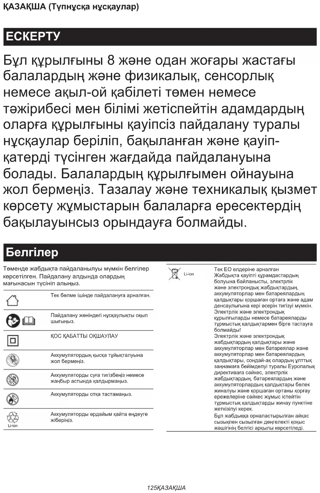 Li-ion Тек ЕО елдеріне арналған Жабдықта қауіпті құрамдастардың болуына байланысты, электрлік және электрондық жабдықтардың, аккумуляторлар мен батареялардың қалдықтары қоршаған ортаға және адам денсаулығына кері әсерін тигізуі мүмкін. Электрлік және электрондық құрылғыларды немесе батареяларды тұрмыстық қалдықтармен бірге тастауға