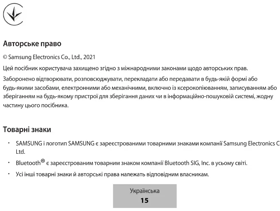 13Авторлық құқық Copyright © 2021 Samsung Electronics Co., Ltd. Бұл нұсқаулық халықаралық авторлық құқықтар туралы заңдармен қорғалған. Бұл нұсқаулықтың ешбір бөлігін кез келген түрде немесе кез келген әдіс, электрондық немесе механикалық, соның ішінде, фотокөшіру, жазу немесе кез келген ақпараттық қоймада және шығарып алу жүйесінде сақтау арқылы көшіруге, таратуға, аударуға немесе тасымалдауға болмайды. Сауда белгілері