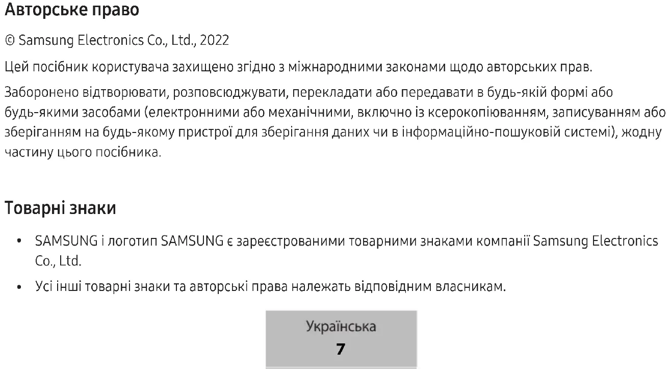 6Авторлық құқық Copyright © 2022 Samsung Electronics Co., Ltd. Бұл нұсқаулық халықаралық авторлық құқықтар туралы заңдармен қорғалған. Бұл нұсқаулықтың ешбір бөлігін кез келген түрде немесе кез келген әдіс, электрондық немесе механикалық, соның ішінде, фотокөшіру, жазу немесе кез келген ақпараттық қоймада және шығарып алу жүйесінде сақтау арқылы көшіруге, таратуға, аударуға немесе тасымалдауға болмайды. Сауда белгілері