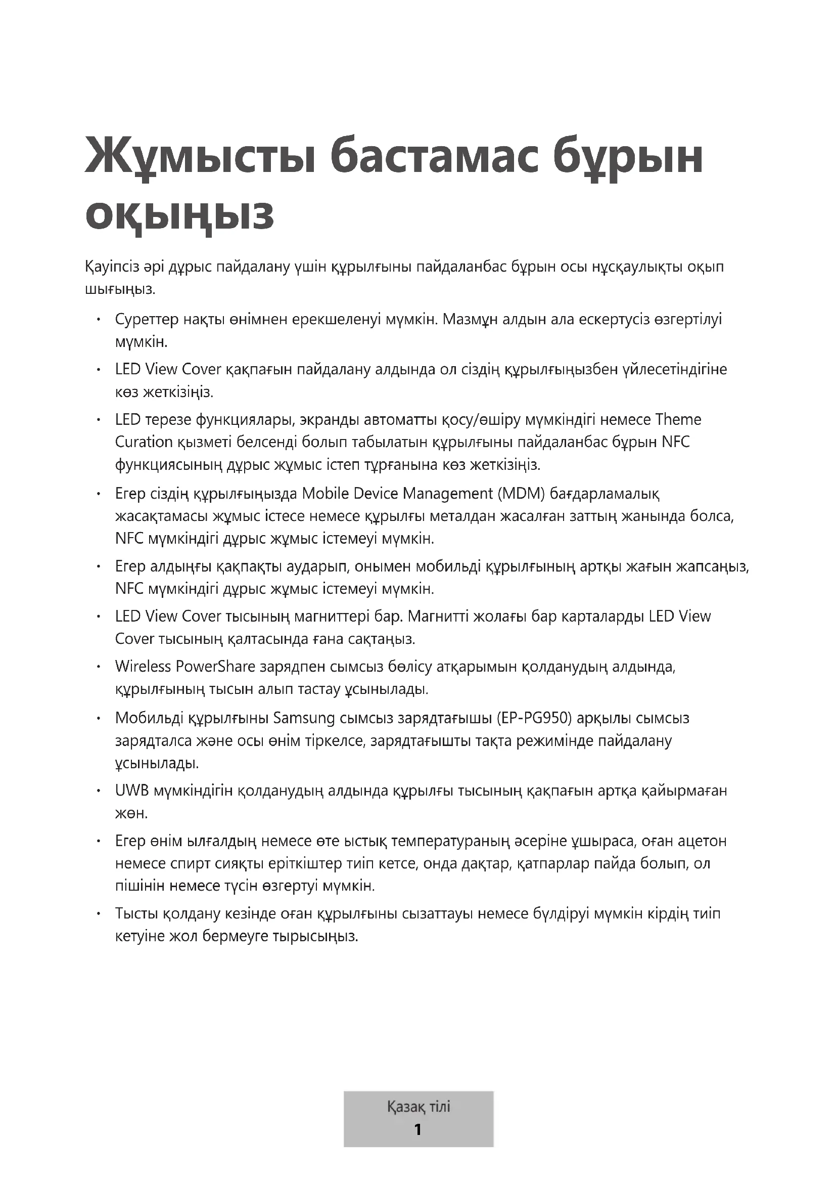 LED терезе функциялары, экранды автоматты қосу/өшіру мүмкіндігі немесе Theme Curation қызметі белсенді болып табылатын құрылғыны пайдаланбас бұрын NFC функциясының дұрыс жұмыс істеп тұрғанына көз жеткізіңіз.