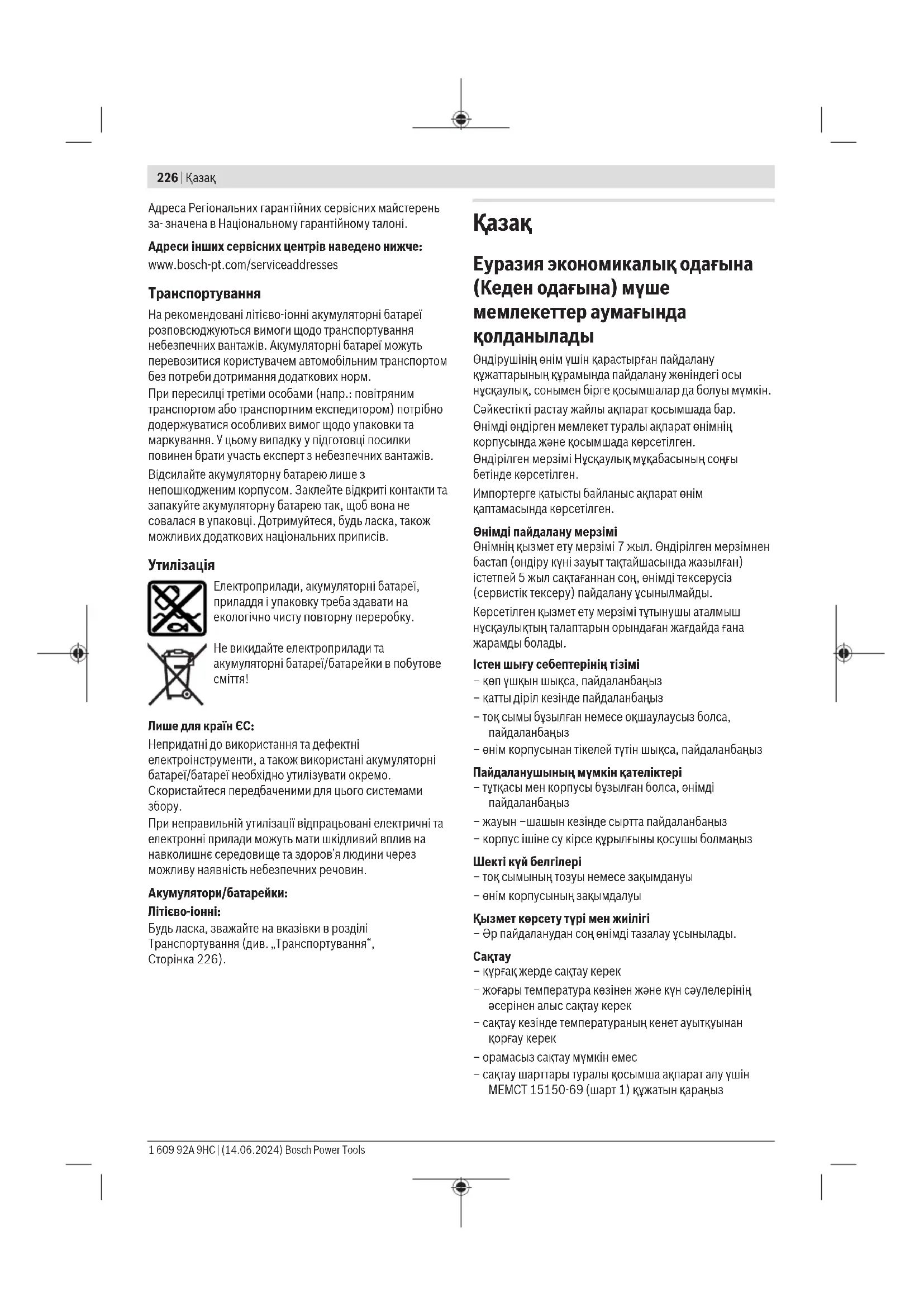– құрғақ жерде сақтау керек – жоғары температура көзінен және күн сәулелерінің әсерінен алыс сақтау керек – сақтау кезінде температураның кенет ауытқуынан қорғау керек – орамасыз сақтау мүмкін емес – сақтау шарттары туралы қосымша ақпарат алу үшін МЕМСТ15150-69 (шарт1) құжатын қараңыз 1 609 92A 9HC | (14.06.2024) Bosch Power ToolsҚазақ | 227 – +5-ден +40°C-қа дейін температурасында қоймада өндірушінің қаптамасында сақтаңыз. Салыстырмалы ылғалдылық 80% -дан аспауы тиіс.