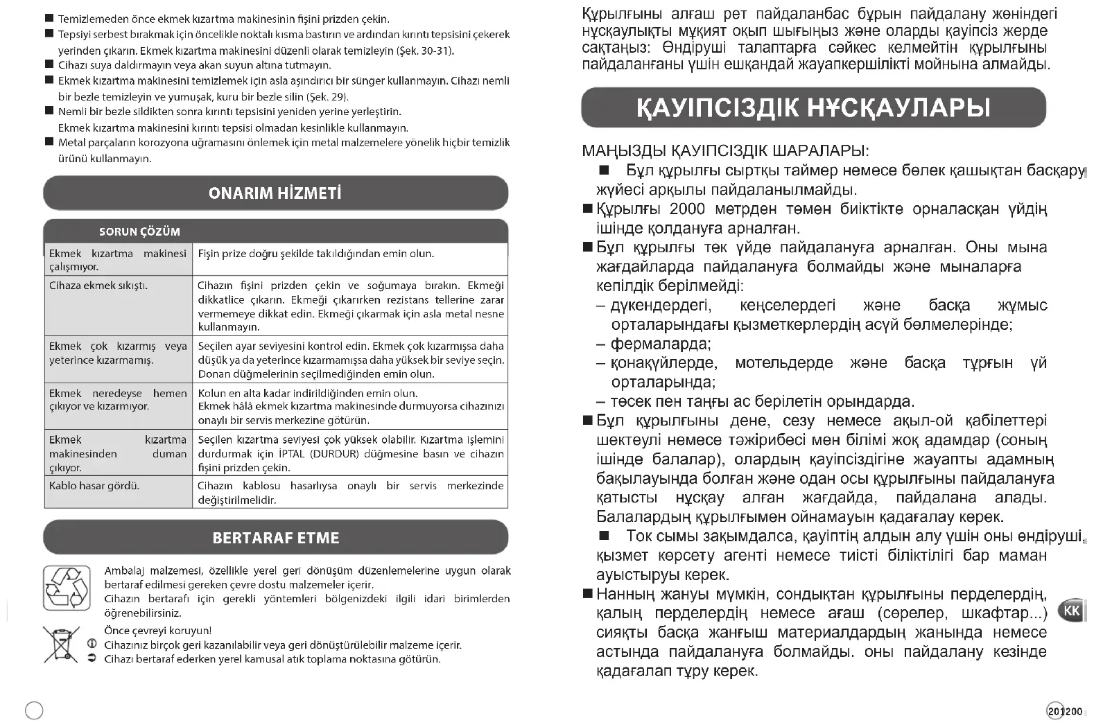 SORUN ÇÖZÜMEkmek kızartma makinesi çalışmıyor. Fişin prize doğru şekilde takıldığından emin olun. Cihaza ekmek sıkıştı. Cihazın şini prizden çekin ve soğumaya bırakın. Ekmeği dikkatlice çıkarın. Ekmeği çıkarırken rezistans tellerine zarar vermemeye dikkat edin. Ekmeği çıkarmak için asla metal nesne kullanmayın. Ekmek çok kızarmış veya yeterince kızarmamış. Seçilen ayar seviyesini kontrol edin. Ekmek çok kızarmışsa daha düşük ya da yeterince kızarmamışsa daha yüksek bir seviye seçin. Donan düğmelerinin seçilmediğinden emin olun.Ekmek neredeyse hemen çıkıyor ve kızarmıyor. Kolun en alta kadar indirildiğinden emin olun. Ekmek hâlâ ekmek kızartma makinesinde durmuyorsa cihazınızı onaylı bir servis merkezine götürün.Ekmek kızartma makinesinden duman çıkıyor. Seçilen kızartma seviyesi çok yüksek olabilir. Kızartma işlemini durdurmak için İPTAL (DURDUR) düğmesine basın ve cihazın şini prizden çekin. Kablo hasar gördü. Cihazın kablosu hasarlıysa onaylı bir servis merkezinde değiştirilmelidir. МАҢЫЗДЫ ҚАУІПСІЗДІК ШАРАЛАРЫ: Бұл құрылғы сыртқы таймер немесе бөлек қашықтан басқару жүйесі арқылы пайдаланылмайды. Құрылғы 2000 метрден төмен биіктікте орналасқан үйдің ішінде қолдануға арналған. Бұл құрылғы тек үйде пайдалануға арналған. Оны мына жағдайларда пайдалануға болмайды және мыналарға кепілдік берілмейді: – дүкендердегі, кеңселердегі және басқа жұмыс орталарындағы қызметкерлердің асүй бөлмелерінде; – фермаларда; – қонақүйлерде, мотельдерде және басқа тұрғын үй орталарында; – төсек пен таңғы ас берілетін орындарда. Бұл құрылғыны дене, сезу немесе ақыл-ой қабілеттері шектеулі немесе тәжірибесі мен білімі жоқ адамдар (соның ішінде балалар), олардың қауіпсіздігіне жауапты адамның бақылауында болған және одан осы құрылғыны пайдалануға қатысты нұсқау алған жағдайда, пайдалана алады. Балалардың құрылғымен ойнамауын қадағалау керек. Ток сымы зақымдалса, қауіптің алдын алу үшін оны өндіруші, қызмет көрсету агенті немесе тиісті біліктілігі бар маман ауыстыруы керек. Нанның жануы мүмкін, сондықтан құрылғыны перделердің, қалың перделердің немесе ағаш (сөрелер, шкафтар...) сияқты басқа жанғыш материалдардың жанында немесе астында пайдалануға болмайды. оны пайдалану кезінде қадағалап тұру керек. ҚАУІПСІЗДІК НҰСҚАУЛАРЫ Құрылғыны алғаш рет пайдаланбас бұрын пайдалану жөніндегі нұсқаулықты мұқият оқып шығыңыз және оларды қауіпсіз жерде сақтаңыз: Өндіруші талаптарға сәйкес келмейтін құрылғыны пайдаланғаны үшін ешқандай жауапкершілікті мойнына алмайды.203202