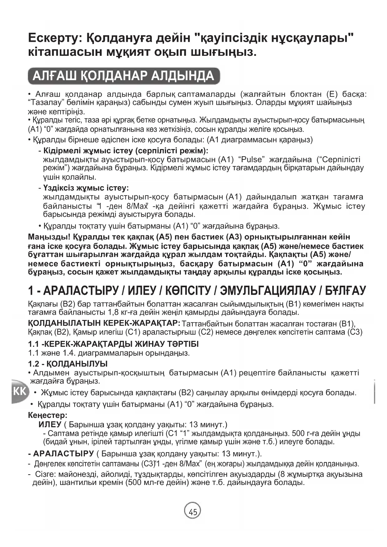 - Миксерді (c2) ауыр қамыр және жылдам қамыр (жайма нан, мәнті, түшпара, т.б.) илеуге қолданбаңыз. - КӨПСІТУ / ЭМУЛЬГАЦИЯЛАУ / БҰЛҒАУ ( Барынша ұзақ қолдану уақыты: 10 минут.).