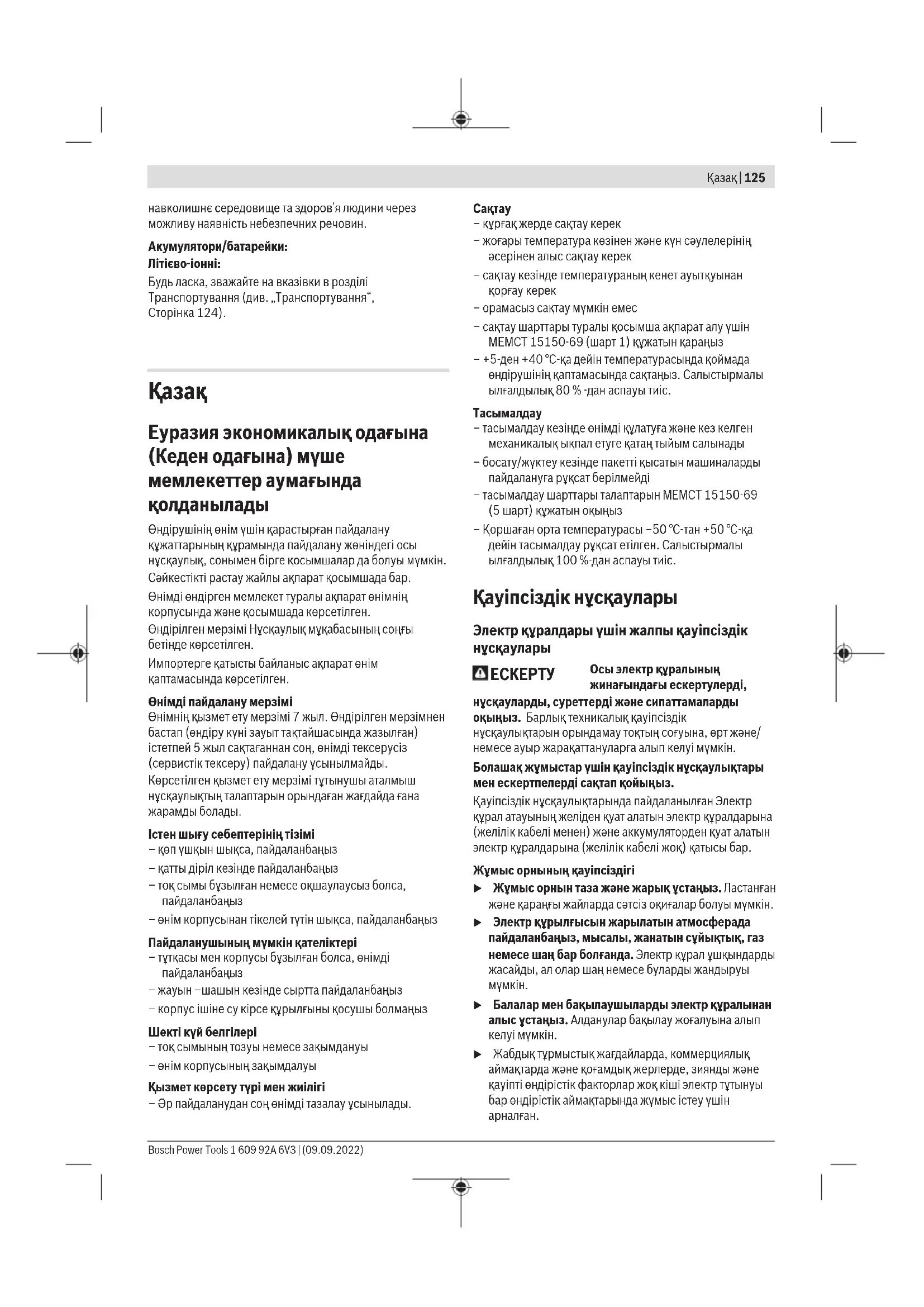 u Бұл қапсырма соққышты электр кабельдерді қысу үшін пайдаланбаңыз. Ол электр кабельдерді орнатуға арналмаған болып электр кабельдердің оқшаулауын зақымдауы мүмкін, бұл арқылы ол элеткр тоқ соғу немесе өрт пайда болуына алып келуі мүмкін. u Қажетті іздеу құралдарын пайдаланып жасырылған сымдарды табыңыз немесе жауапты жергілікті ұйым өкілдерін шақырыңыз. Электр сымдарына тию өрт немесе тоқ соғуына алып келуі мүмкін. Газ құбырын зақымдау жарылысқа алып келуі мүмкін. Су құбырын зақымдау материалдық зиянға алып келуі мүмкін. u Аккумулятор зақымдалған немесе дұрыс пайдаланылмаған жағдайда, одан бу шығуы мүмкін. Аккумулятор жанып немесе жарылып қалуы мүмкін. Таза ауа ішке тартыңыз және шағымдар болса, дәрігердің көмегіне жүгініңіз. Бу тыныс алу жолдарын тітіркендіруі мүмкін. Bosch Power Tools 1 609 92A 6V3 | (09.09.2022)128 | Қазақ u Аккумуляторды ашпаңыз. Қысқа тұйықталу қауіпі u Шеге немесе бұрауыш сияқты ұшты заттар немесе сыртқы әсер арқылы аккумулулятор зақымдануы мүмкін. Бұл қысқа тұйықталуға алып келіп, аккумулятор жануы, түтін шығаруы, жарылуы немесе қызып кетуі мүмкін. u Бұл аккумуляторды тек қана осы өндіруші өнімдерінде пайдаланыңыз. Сол арқылы аккумуляторды қауіпті, артық жүктеуден сақтайсыз. Аккумуляторды, жылудан, сондай-ақ, мысалы, үздіксіз күн жарығынан, оттан, кірден, судан және ылғалдан қорғаңыз. Жарылыс және қысқа тұйықталу қаупі