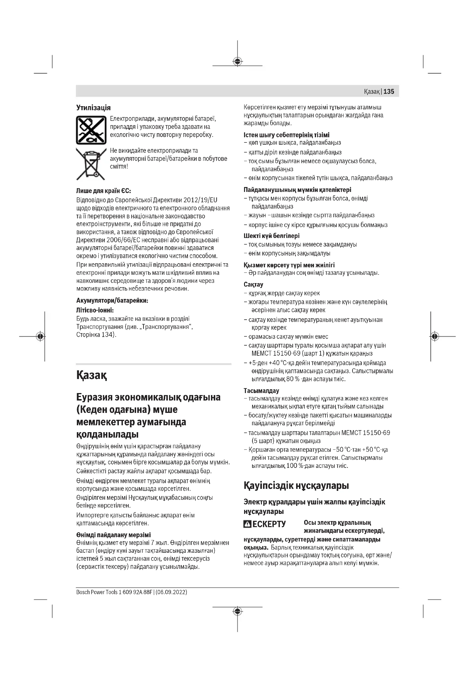 Аккумуляторды тек –20°C...50°C температура ауқымында сақтаңыз. Аккумуляторды жазда көлікте қалдырмаңыз. Bosch Power Tools 1 609 92A 88F | (06.09.2022)140 | Қазақ Пайдалану мерзімінің айтарлықтай қысқаруы аккумулятордың ескіргенін және ауыстыру керектігін