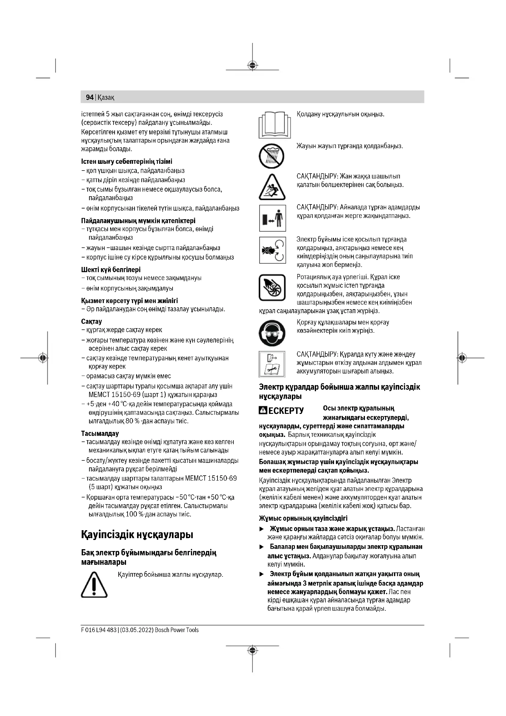 Еуразия экономикалық одағына (Кеден одағына) мүше мемлекеттер аумағында қолданылады Өндірушінің өнім үшін қарастырған пайдалану құжаттарының құрамында пайдалану жөніндегі осы нұсқаулық, сонымен бірге қосымшалар да болуы мүмкін. Сəйкестікті растау жайлы ақпарат қосымшада бар. Өнімді өндірген мемлекет туралы ақпарат өнімнің корпусында жəне қосымшада көрсетілген. Өндірілген мерзімі Нұсқаулық мұқабасының соңғы бетінде көрсетілген. Импортерге қатысты байланыс ақпарат өнім қаптамасында көрсетілген. Өнімді пайдалану мерзімі Өнімнің қызмет ету мерзімі 7жыл. Өндірілген мерзімнен бастап (өндіру күні зауыт тақтайшасында жазылған) Bosch Power Tools F 016 L94 483 | (03.05.2022)94 | Қазақ істетпей 5жыл сақтағаннан соң, өнімді тексерусіз (сервистік тексеру) пайдалану ұсынылмайды. Көрсетілген қызмет ету мерзімі тұтынушы аталмыш нұсқаулықтың талаптарын орындаған жағдайда ғана жарамды болады. Iстен шығу себептерінің тізімі – қөп үшқын шықса, пайдаланбаңыз – қатты діріл кезінде пайдаланбаңыз – тоқ сымы бұзылған немесе оқшаулаусыз болса, пайдаланбаңыз – өнім корпусынан тікелей түтін шықса, пайдаланбаңыз Пайдаланушының мүмкін қателіктері – тұтқасы мен корпусы бұзылған болса, өнімді пайдаланбаңыз – жауын –шашын кезінде сыртта пайдаланбаңыз – корпус ішіне су кірсе құрылғыны қосушы болмаңыз Шекті күй белгілері – тоқ сымының тозуы немесе зақымдануы – өнім корпусының зақымдалуы Қызмет көрсету түрі мен жиілігі – Әр пайдаланудан соң өнімді тазалау ұсынылады.