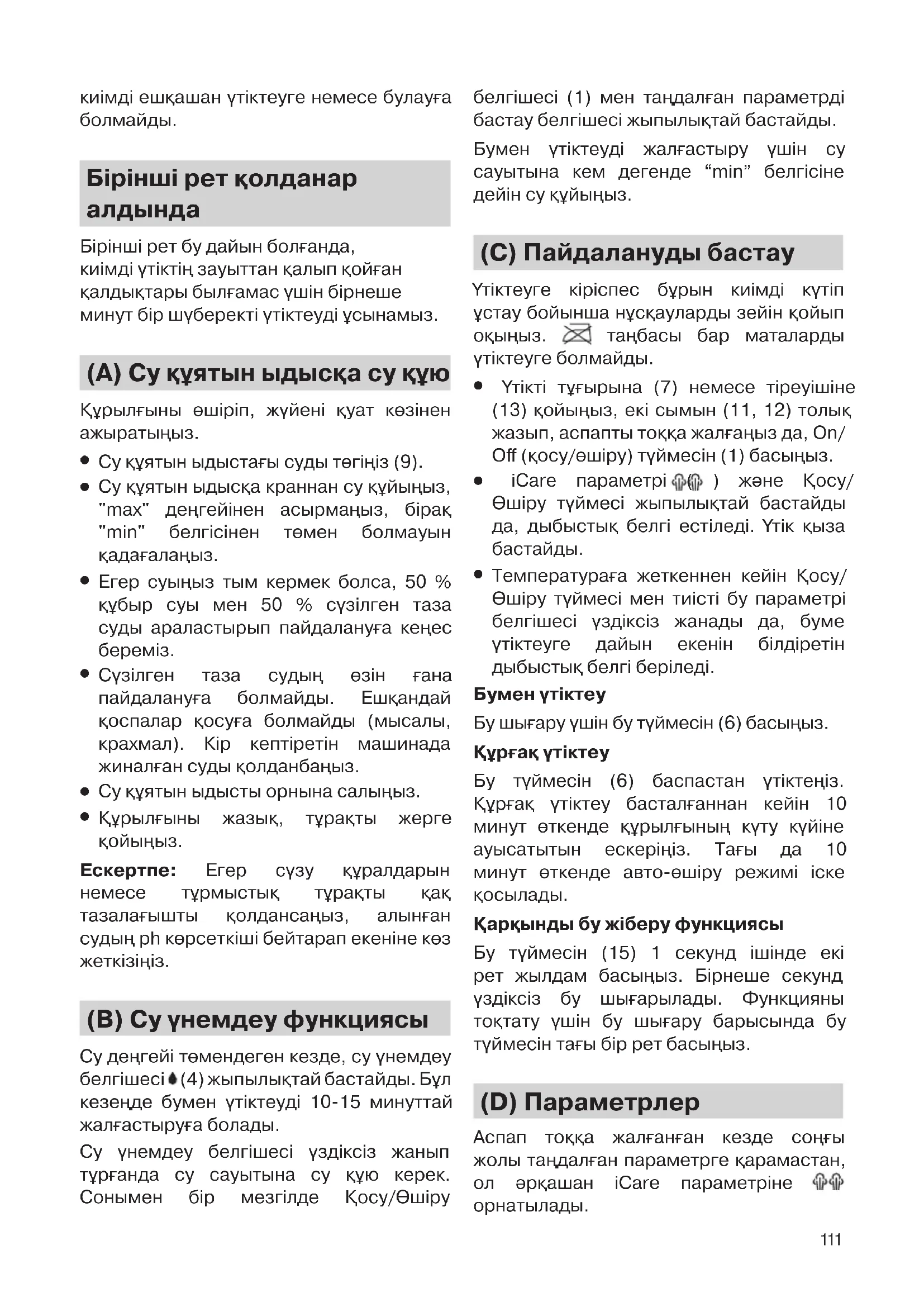 Қарқынды бу жіберу функциясы Бу түймесін (15) 1 секунд ішінде екі рет жылдам басыңыз. Бірнеше секунд үздіксіз бу шығарылады. Функцияны тоқтату үшін бу шығару барысында бу түймесін тағы бір рет басыңыз. (D) Параметрлер Аспап тоққа жалғанған кезде соңғы жолы таңдалған параметрге қарамастан, ол әрқашан iCare параметріне орнатылады. 5712812451_IS72xx_INT.indd 1115712812451_IS72xx_INT.indd 111 08.11.21 08:3008.11.21 08:30112 Бір параметрден екіншісіне ауысу үшін iMode тетігін (5a) басыңыз. Eco Синтетика, жібек және аралас материалдар сияқты нәзік заттарды үтіктеуге қолайлы. Бұл режимде қуат үнемдеу мүмкіндігі бар. iCare Жүн, полистер және мақтадан жасалған заттарды үтіктеуге қолайлы. Turbo Мақта/зығыр және джинси сияқты күшті буды қажет ететін материалдардан жасалған заттарды үтіктеуге қолайлы. Бұл параметрді сондай-ақ киер алдында шкафта болған киім-кешекті жаңалап, тазарту үшін пайдалануға болады. Ескертпе: Тазарту функциясын адамдарға немесе үй жануарларына пайдалануға болмайды. Қарқынды булау (тек CareStyle 7 Pro) Осы парамердің көмегімен ең мол бумен 15 минут бойы үтіктеуге болады.