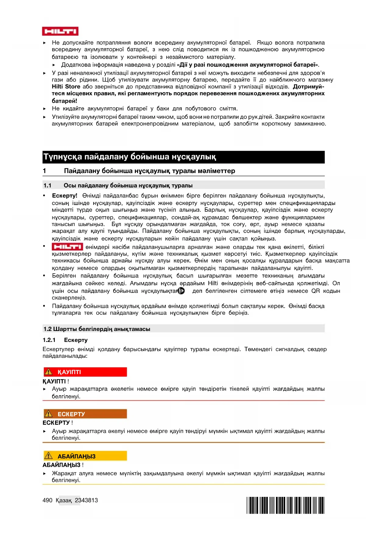 Бұл пайдалану бойынша нұсқаулықта төмендегі белгілер пайдаланылады: Пайдалану бойынша нұсқаулықты ұстану Аспапты пайдалану бойынша нұсқаулар және басқа пайдалы ақпарат Айқас сілтеме Қайта пайдалануға болатын материалдармен жұмыс істеу Электр аспаптарды және аккумуляторларды тұрмыстық қоқысқа тастамаңыз Hilti Литий-иондық аккумулятор Hilti зарядтағыш құрылғысы