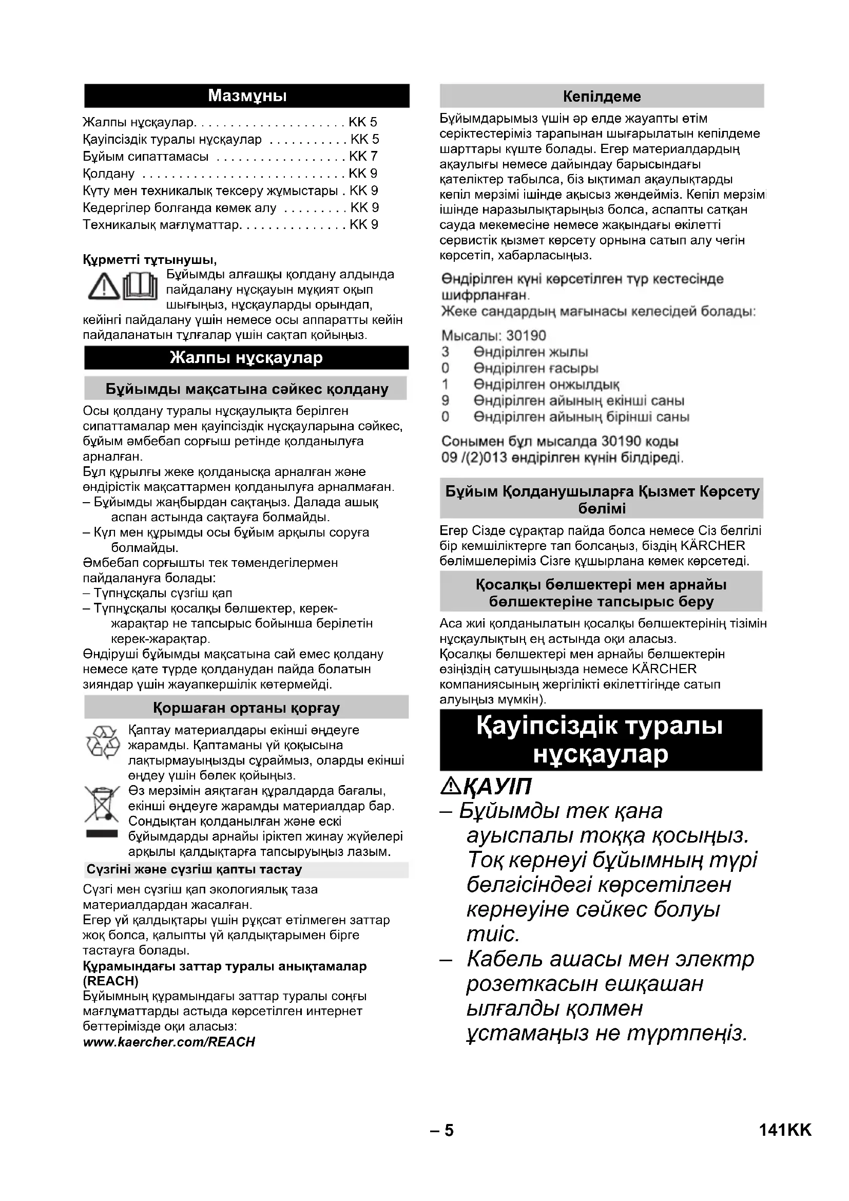 Əмбебап сорғышты тек төмендегілермен пайдалануға болады: – Түпнұсқалы сүзгіш қап – Түпнұсқалы қосалқы бөлшектер, керек- жарақтар не тапсырыс бойынша берілетін керек-жарақтар. Өндіруші бұйымды мақсатына сай емес қолдану немесе қате түрде қолданудан пайда болатын зияндар үшін жауапкершілік көтермейді. Қаптау материалдары екінші өңдеуге жарамды. Қаптаманы үй қоқысына лақтырмауыңызды сұраймыз, оларды екінші өңдеу үшін бөлек қойыңыз. Өз мерзімін аяқтаған құралдарда бағалы, екінші өңдеуге жарамды материалдар бар. Сондықтан қолданылған жəне ескі бұйымдарды арнайы іріктеп жинау жүйелері арқылы қалдықтарға тапсыруыңыз лазым. Сүзгі мен сүзгіш қап экологиялық таза материалдардан жасалған. Егер үй қалдықтары үшін рұқсат етілмеген заттар жоқ болса, қалыпты үй қалдықтарымен бірге тастауға болады. Құрамындағы заттар туралы анықтамалар (REACH) Бұйымның құрамындағы заттар туралы соңғы мағлұматтарды астыда көрсетілген интернет беттерімізде оқи аласыз: www.kaercher.com/REACH Бұйымдарымыз үшін əр елде жауапты өтім серіктестеріміз тарапынан шығарылатын кепілдеме шарттары күште болады. Егер материалдардың ақаулығы немесе дайындау барысындағы қателіктер табылса, біз ықтимал ақаулықтарды кепіл мерзімі ішінде ақысыз жөндейміз. Кепіл мерзімі ішінде наразылықтарыңыз болса, аспапты сатқан сауда мекемесіне немесе жақындағы өкілетті сервистік қызмет көрсету орнына сатып алу чегін көрсетіп, хабарласыңыз. Егер Сізде сұрақтар пайда болса немесе Сіз белгілі бір кемшіліктерге тап болсаңыз, біздің KÄRCHER бөлімшелеріміз Сізге құшырлана көмек көрсетеді. Аса жиі қолданылатын қосалқы бөлшектерінің тізімін нұсқаулықтың ең астында оқи аласыз. Қосалқы бөлшектері мен арнайы бөлшектерін өзіңіздің сатушыңызда немесе KÄRCHER компаниясының жергілікті өкілеттігінде сатып алуыңыз мүмкін).
