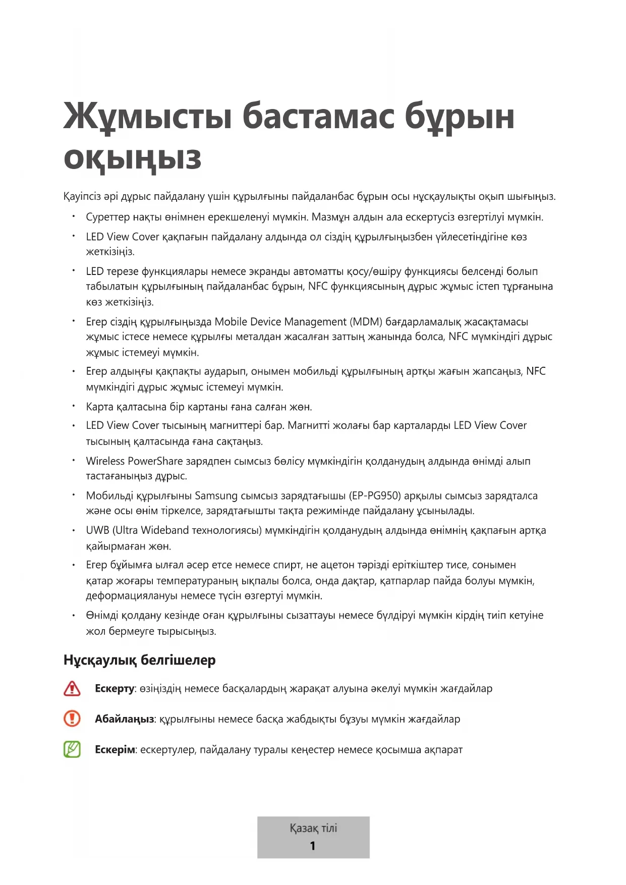 Қауіпсіз әрі дұрыс пайдалану үшін құрылғыны пайдаланбас бұрын осы нұсқаулықты оқып шығыңыз. Суреттер нақты өнімнен ерекшеленуі мүмкін. Мазмұн алдын ала ескертусіз өзгертілуі мүмкін. LED View Cover қақпағын пайдалану алдында ол сіздің құрылғыңызбен үйлесетіндігіне көз жеткізіңіз. LED терезе функциялары немесе экранды автоматты қосу/өшіру функциясы белсенді болып табылатын құрылғының пайдаланбас бұрын, NFC функциясының дұрыс жұмыс істеп тұрғанына көз жеткізіңіз. Егер сіздің құрылғыңызда Mobile Device Management (MDM) бағдарламалық жасақтамасы жұмыс істесе немесе құрылғы металдан жасалған заттың жанында болса, NFC мүмкіндігі дұрыс жұмыс істемеуі мүмкін. Егер алдыңғы қақпақты аударып, онымен мобильді құрылғының артқы жағын жапсаңыз, NFC мүмкіндігі дұрыс жұмыс істемеуі мүмкін. Карта қалтасына бір картаны ғана салған жөн. LED View Cover тысының магниттері бар. Магнитті жолағы бар карталарды LED View Cover тысының қалтасында ғана сақтаңыз. Wireless PowerShare зарядпен сымсыз бөлісу мүмкіндігін қолданудың алдында өнімді алып тастағаныңыз дұрыс. Мобильді құрылғыны Samsung сымсыз зарядтағышы (EP-PG950) арқылы сымсыз зарядталса және осы өнім тіркелсе, зарядтағышты тақта режимінде пайдалану ұсынылады. UWB (Ultra Wideband технологиясы) мүмкіндігін қолданудың алдында өнімнің қақпағын артқа қайырмаған жөн. Егер бұйымға ылғал әсер етсе немесе спирт, не ацетон тәрізді еріткіштер тисе, сонымен қатар жоғары температураның ықпалы болса, онда дақтар, қатпарлар пайда болуы мүмкін, деформациялануы немесе түсін өзгертуі мүмкін. Өнімді қолдану кезінде оған құрылғыны сызаттауы немесе бүлдіруі мүмкін кірдің тиіп кетуіне жол бермеуге тырысыңыз. Нұсқаулық белгішелер Ескерту: өзіңіздің немесе басқалардың жарақат алуына әкелуі мүмкін жағдайларАбайлаңыз: құрылғыны немесе басқа жабдықты бұзуы мүмкін жағдайларЕскерім: ескертулер, пайдалану туралы кеңестер немесе қосымша ақпарат