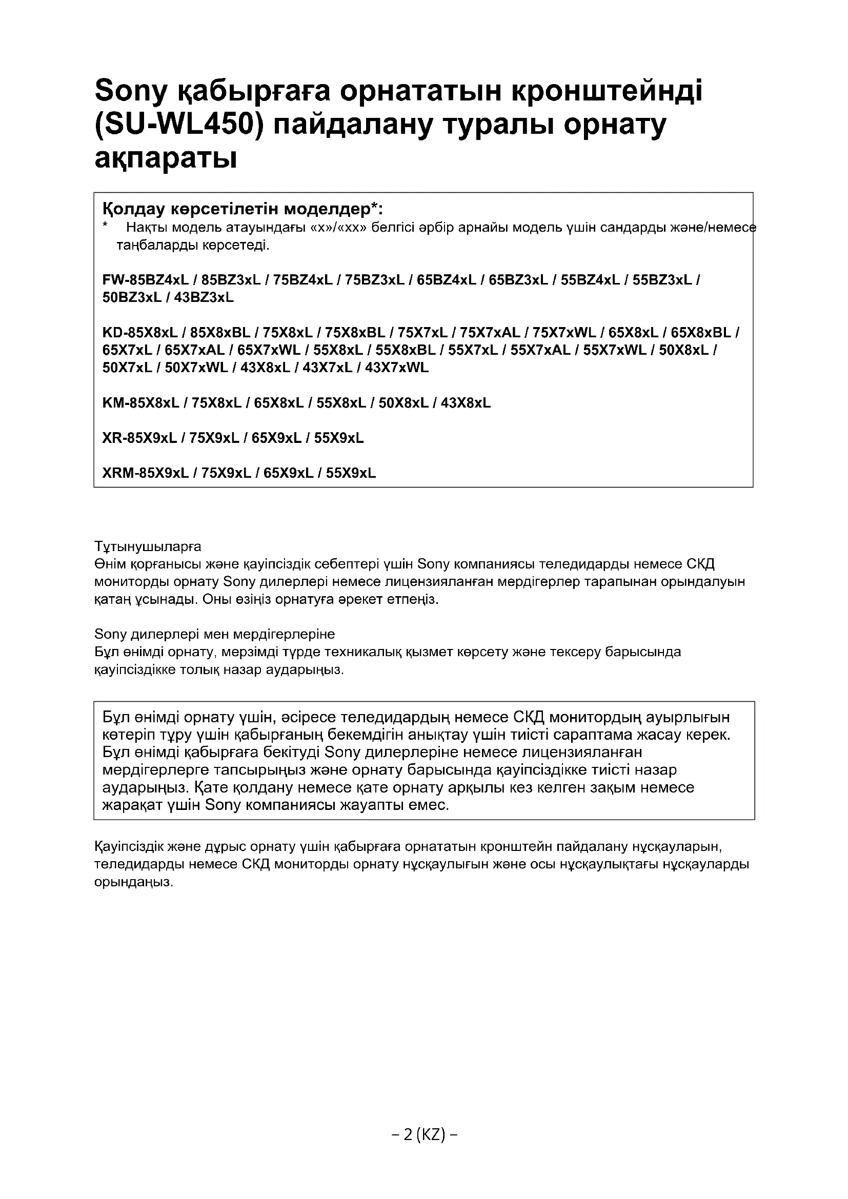 - Нақтымодельатауындағы«x»/«xx»белгісіəрбірарнайымодельүшінсандардыжəне/немесе таңбалардыкөрсетеді. FW-85BZ4xL / 85BZ3xL / 75BZ4xL / 75BZ3xL / 65BZ4xL / 65BZ3xL / 55BZ4xL / 55BZ3xL / 50BZ3xL / 43BZ3xL KD-85X8xL / 85X8xBL / 75X8xL / 75X8xBL / 75X7xL / 75X7xAL / 75X7xWL / 65X8xL / 65X8xBL / 65X7xL / 65X7xAL / 65X7xWL / 55X8xL / 55X8xBL / 55X7xL / 55X7xAL / 55X7xWL / 50X8xL / 50X7xL / 50X7xWL / 43X8xL / 43X7xL / 43X7xWL KM-85X8xL / 75X8xL / 65X8xL / 55X8xL / 50X8xL / 43X8xL XR-85X9xL / 75X9xL / 65X9xL / 55X9xL XRM-85X9xL / 75X9xL / 65X9xL / 55X9xL Тұтынушыларға ӨнімқорғанысыжəнеқауіпсіздіксебептеріүшінSonyкомпаниясытеледидардынемесеСКД монитордыорнатуSonyдилерлерінемеселицензияланғанмердігерлертарапынанорындалуын қатаңұсынады.Оныөзіңізорнатуғаəрекететпеңіз. Sonyдилерлеріменмердігерлеріне Бұлөнімдіорнату,мерзімдітүрдетехникалыққызметкөрсетужəнетексерубарысында қауіпсіздіккетолықназараударыңыз. Бұлөнімдіорнатуүшін,əсіресетеледидардыңнемесеСКДмонитордыңауырлығын көтеріптұруүшінқабырғаныңбекемдігінанықтауүшінтиістісараптамажасаукерек. БұлөнімдіқабырғағабекітудіSonyдилерлеріненемеселицензияланған мердігерлергетапсырыңызжəнеорнатубарысындақауіпсіздіккетиістіназар аударыңыз.Қатеқолданунемесеқатеорнатуарқылыкезкелгензақымнемесе жарақатүшінSonyкомпаниясыжауаптыемес. Қауіпсіздікжəнедұрысорнатуүшінқабырғағаорнататынкронштейнпайдаланунұсқауларын, теледидардынемесеСКДмонитордыорнатунұсқаулығынжəнеосынұсқаулықтағынұсқауларды орындаңыз.− 3 (KZ) −