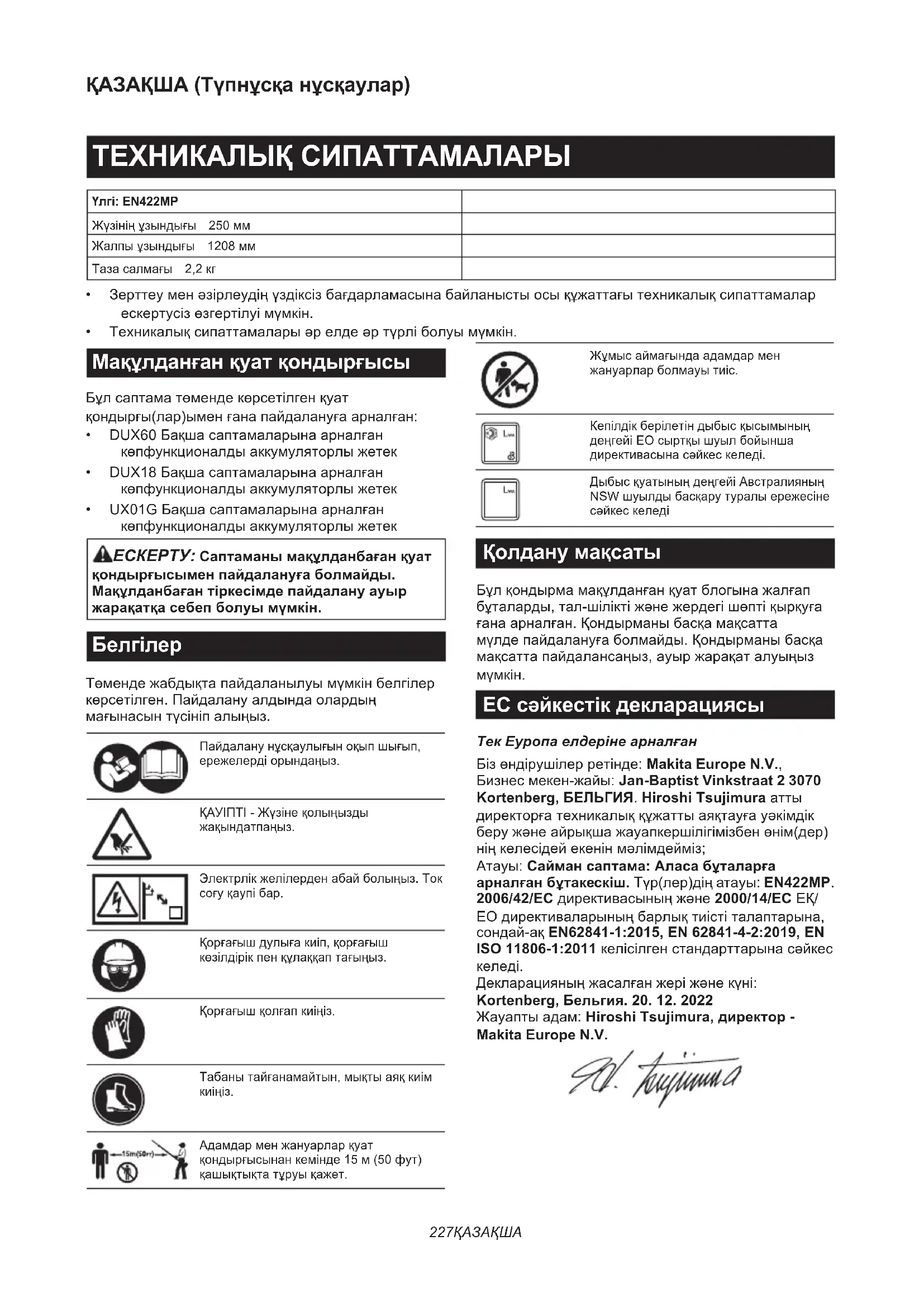 Декларацияныңжасалғанжеріжәнекүні: Kortenberg, Бельгия. 20. 12. 2022 Жауаптыадам:Hiroshi Tsujimura, директор - Makita Europe N.V.228 ҚАЗАҚША ҚАУІПСІЗДІК БОЙЫНША