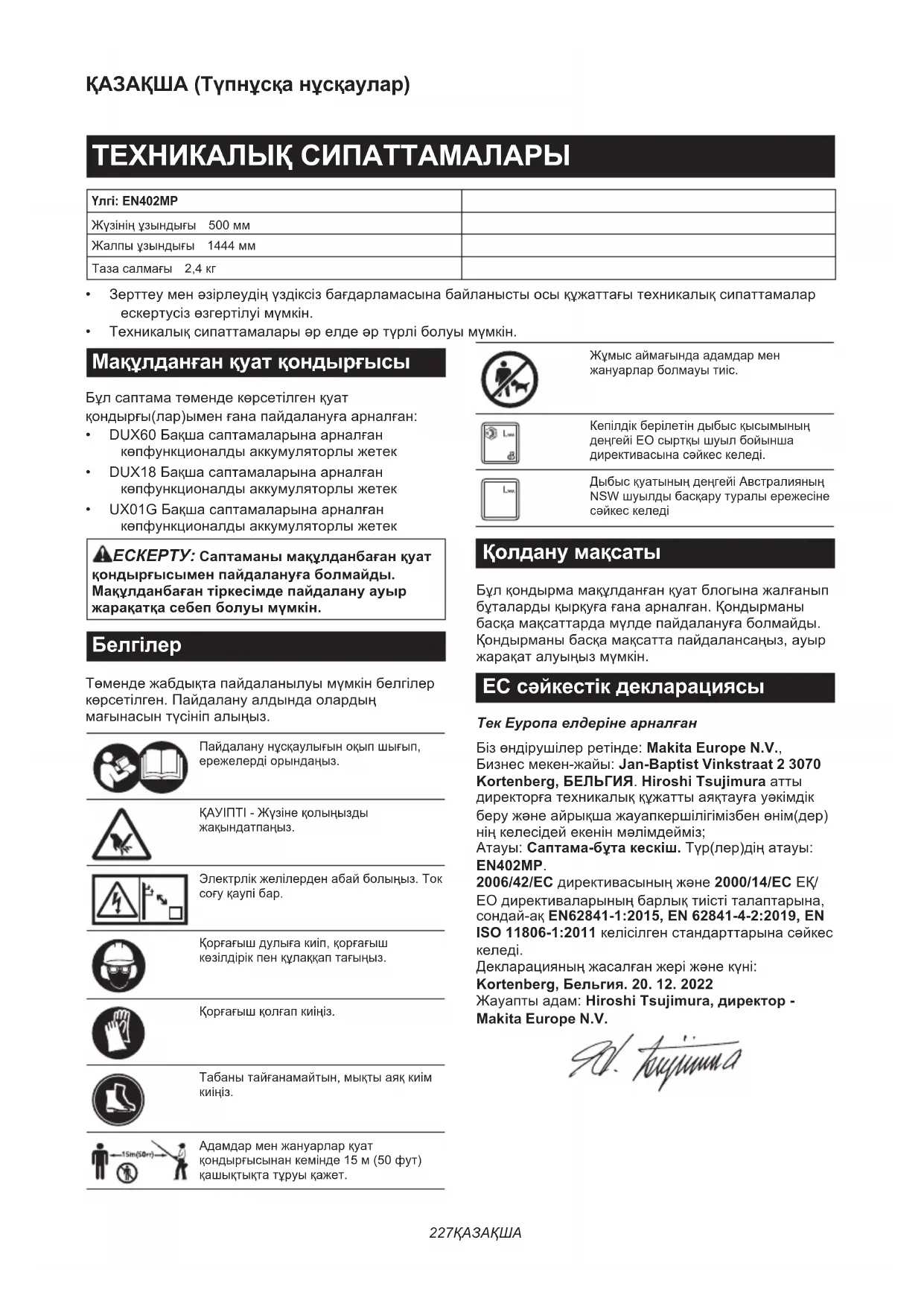 Декларацияныңжасалғанжеріжәнекүні: Kortenberg, Бельгия. 20. 12. 2022 Жауаптыадам:Hiroshi Tsujimura, директор - Makita Europe N.V.228 ҚАЗАҚША ҚАУІПСІЗДІК БОЙЫНША