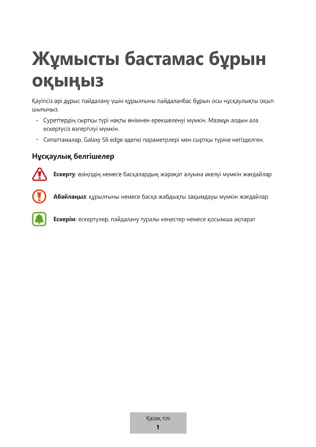 Сипаттамалар, Galaxy S6 edge әдепкі параметрлері мен сыртқы түріне негізделген. Нұсқаулық белгішелер Ескерту: өзіңіздің немесе басқалардың жарақат алуына әкелуі мүмкін жағдайлар Абайлаңыз: құрылғыны немесе басқа жабдықты зақымдауы мүмкін жағдайлар Ескерім: ескертулер, пайдалану туралы кеңестер немесе қосымша ақпарат
