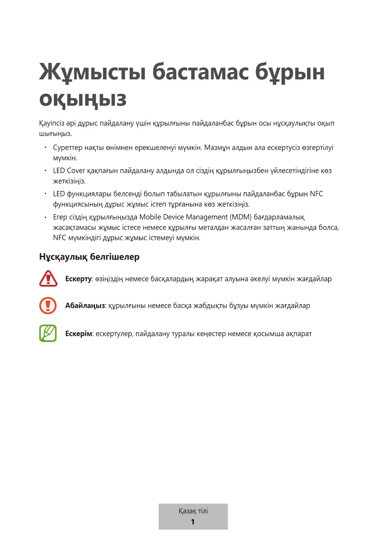 Егер сіздің құрылғыңызда Mobile Device Management (MDM) бағдарламалық жасақтамасы жұмыс істесе немесе құрылғы металдан жасалған заттың жанында болса, NFC мүмкіндігі дұрыс жұмыс істемеуі мүмкін. Нұсқаулық белгішелер Ескерту: өзіңіздің немесе басқалардың жарақат алуына әкелуі мүмкін жағдайлар Абайлаңыз: құрылғыны немесе басқа жабдықты бұзуы мүмкін жағдайлар Ескерім: ескертулер, пайдалану туралы кеңестер немесе қосымша ақпарат