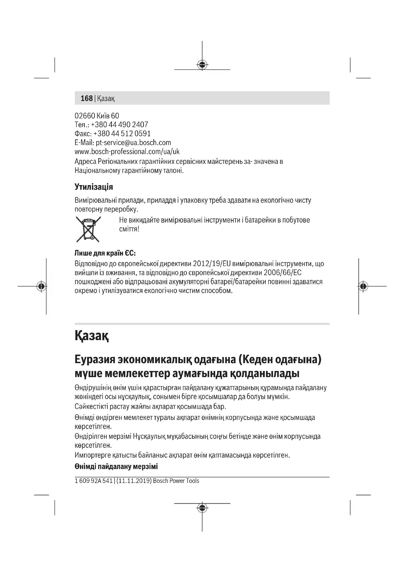 Еуразия экономикалық одағына (Кеден одағына) мүше мемлекеттер аумағында қолданылады Өндірушінің өнім үшін қарастырған пайдалану құжаттарының құрамында пайдалану жөніндегі осы нұсқаулық, сонымен бірге қосымшалар да болуы мүмкін. Сəйкестікті растау жайлы ақпарат қосымшада бар. Өнімді өндірген мемлекет туралы ақпарат өнімнің корпусында жəне қосымшада көрсетілген. Өндірілген мерзімі Нұсқаулық мұқабасының соңғы бетінде және өнім корпусында көрсетілген. Импортерге қатысты байланыс ақпарат өнім қаптамасында көрсетілген. Өнімді пайдалану мерзімі 1 609 92A 541 | (11.11.2019) Bosch Power ToolsҚазақ | 169 Өнімнің қызмет ету мерзімі 7 жыл. Өндірілген мерзімнен бастап (өндіру күні зауыт тақтайшасында жазылған) істетпей 5 жыл сақтағаннан соң, өнімді тексерусіз (сервистік тексеру) пайдалану ұсынылмайды. Қызметкер немесе пайдаланушының қателіктері мен істен шығу себептерінің