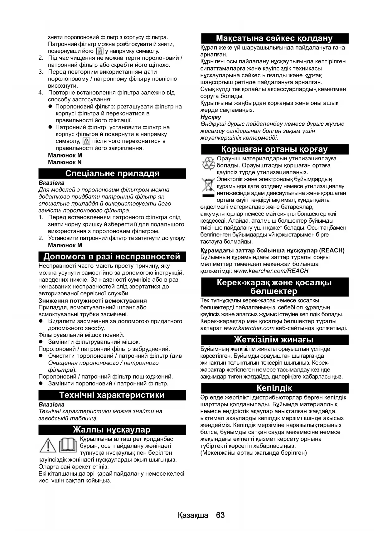 лгіленген бұйымдарды үй қоқыстарымен бірге тастауға болмайды. Құрамдағы заттар бойынша нұсқаулар (REACH) Бұйымның құрамындағы заттар туралы соңғы мəліметтер төмендегі мекенжай бойынша қолжетімді: www.kaercher.com/REACH Керек-жарақ жəне қосалқы