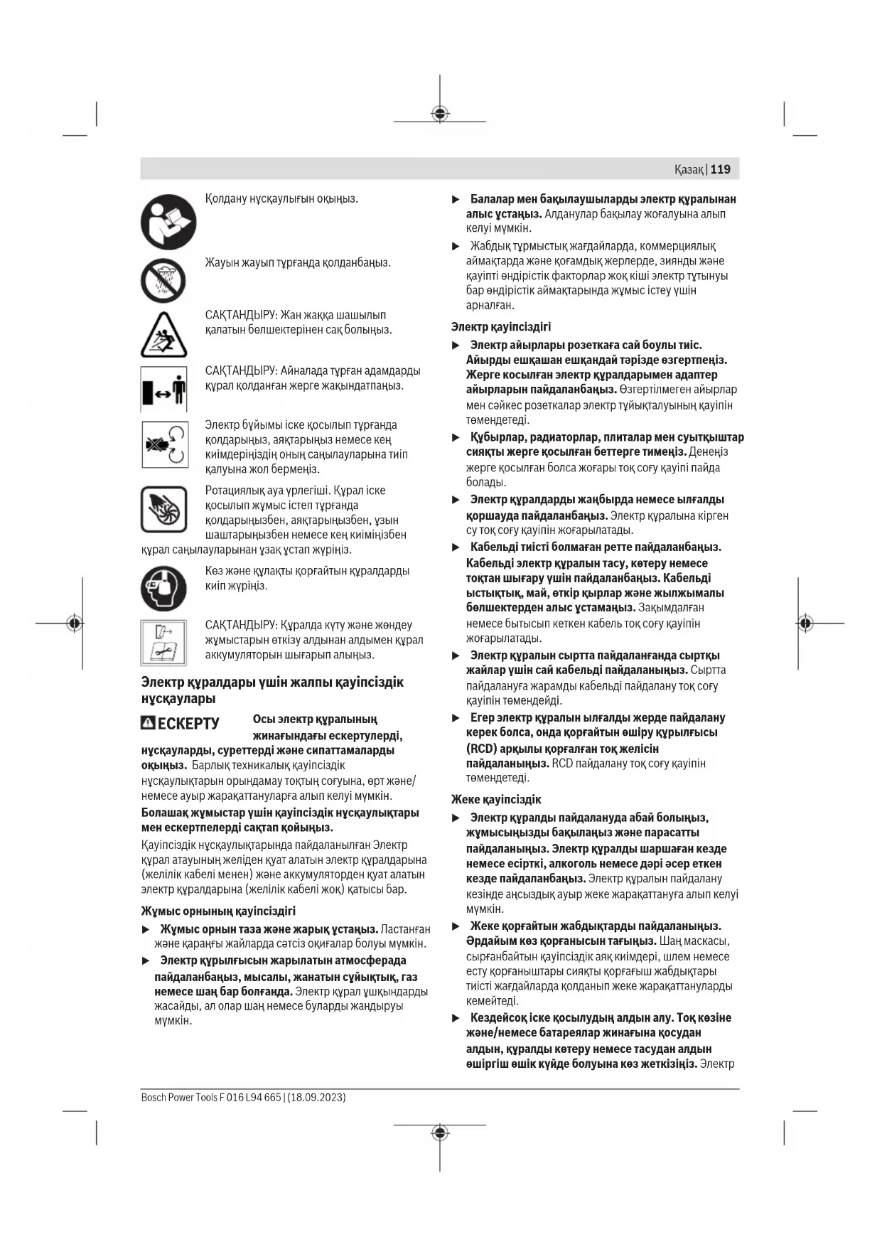 Қауіптер бойынша жалпы нұсқаулар. F 016 L94 665 | (18.09.2023) Bosch Power ToolsҚазақ | 119 Қолдану нұсқаулығын оқыңыз. Жауын жауып тұрғанда қолданбаңыз. САҚТАНДЫРУ: Жан жаққа шашылып қалатын бөлшектерінен сақ болыңыз. САҚТАНДЫРУ: Айналада тұрған адамдарды құрал қолданған жерге жақындатпаңыз. Электр бұйымы іске қосылып тұрғанда қолдарыңыз, аяқтарыңыз немесе кең киімдеріңіздің оның саңылауларына тиіп қалуына жол бермеңіз. Ротациялық ауа үрлегіші. Құрал іске қосылып жұмыс істеп тұрғанда қолдарыңызбен, аяқтарыңызбен, ұзын шаштарыңызбен немесе кең киіміңізбен құрал саңылауларынан ұзақ ұстап жүріңіз. Көз және құлақты қорғайтын құралдарды киіп жүріңіз. САҚТАНДЫРУ: Құралда күту және жөндеу жұмыстарын өткізу алдынан алдымен құрал аккумуляторын шығарып алыңыз. Электр құралдары үшін жалпы қауіпсіздік