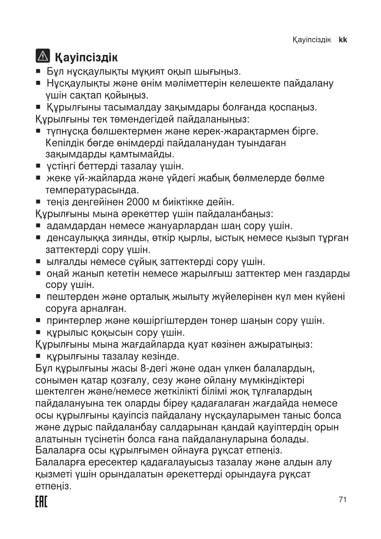 ¡ пештерден және орталық жылыту жүйелерінен күл мен күйені соруға арналған. ¡ принтерлер және көшіргіштерден тонер шаңын сору үшін. ¡ құрылыс қоқысын сору үшін. Құрылғыны мына жағдайларда қуат көзінен ажыратыңыз: ¡ құрылғыны тазалау кезінде. Бұл құрылғыны жасы 8-дегі және одан үлкен балалардың, сонымен қатар қозғалу, сезу және ойлану мүмкіндіктері шектелген және/немесе жеткілікті білімі жоқ тұлғалардың пайдалануына тек оларды біреу қадағалаған жағдайда немесе осы құрылғыны қауіпсіз пайдалану нұсқауларымен таныс болса және дұрыс пайдаланбау салдарынан қандай қауіптердің орын алатынын түсінетін болса ғана пайдалануларына болады. Балаларға осы құрылғымен ойнауға рұқсат етпеңіз. Балаларға ересектер қадағалауысыз тазалау және алдын алу қызметі үшін орындалатын әрекеттерді орындауға рұқсат етпеңіз.kk Қауіпсіздік