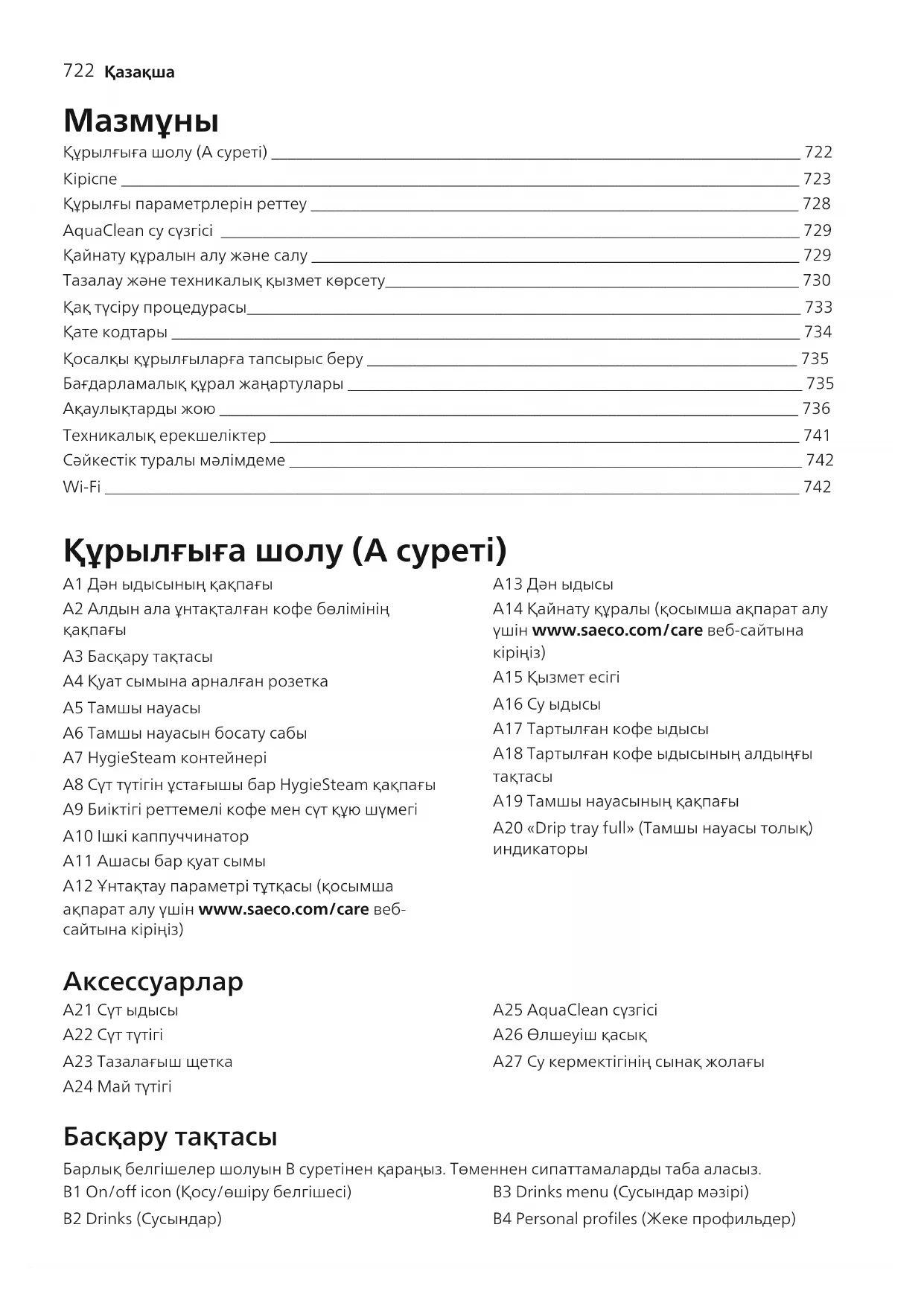 Құрылғыға шолу (A суреті) ________________________________________________________________ 722 Кіріспе __________________________________________________________________________________ 723 Құрылғы параметрлерін реттеу ___________________________________________________________ 728 AquaClean су сүзгісі ______________________________________________________________________ 729 Қайнату құралын алу және салу ___________________________________________________________ 729 Тазалау және техникалық қызмет көрсету__________________________________________________ 730 Қақ түсіру процедурасы___________________________________________________________________ 733 Қате кодтары ____________________________________________________________________________ 734 Қосалқы құрылғыларға тапсырыс беру ____________________________________________________ 735 Бағдарламалық құрал жаңартулары _______________________________________________________ 735 Ақаулықтарды жою ______________________________________________________________________ 736 Техникалық ерекшеліктер ________________________________________________________________ 741 Сәйкестік туралы мәлімдеме ______________________________________________________________ 742 Wi-Fi ____________________________________________________________________________________ 742 Құрылғыға шолу (A суреті) A1 Дән ыдысының қақпағы A2 Алдын ала ұнтақталған кофе бөлімінің