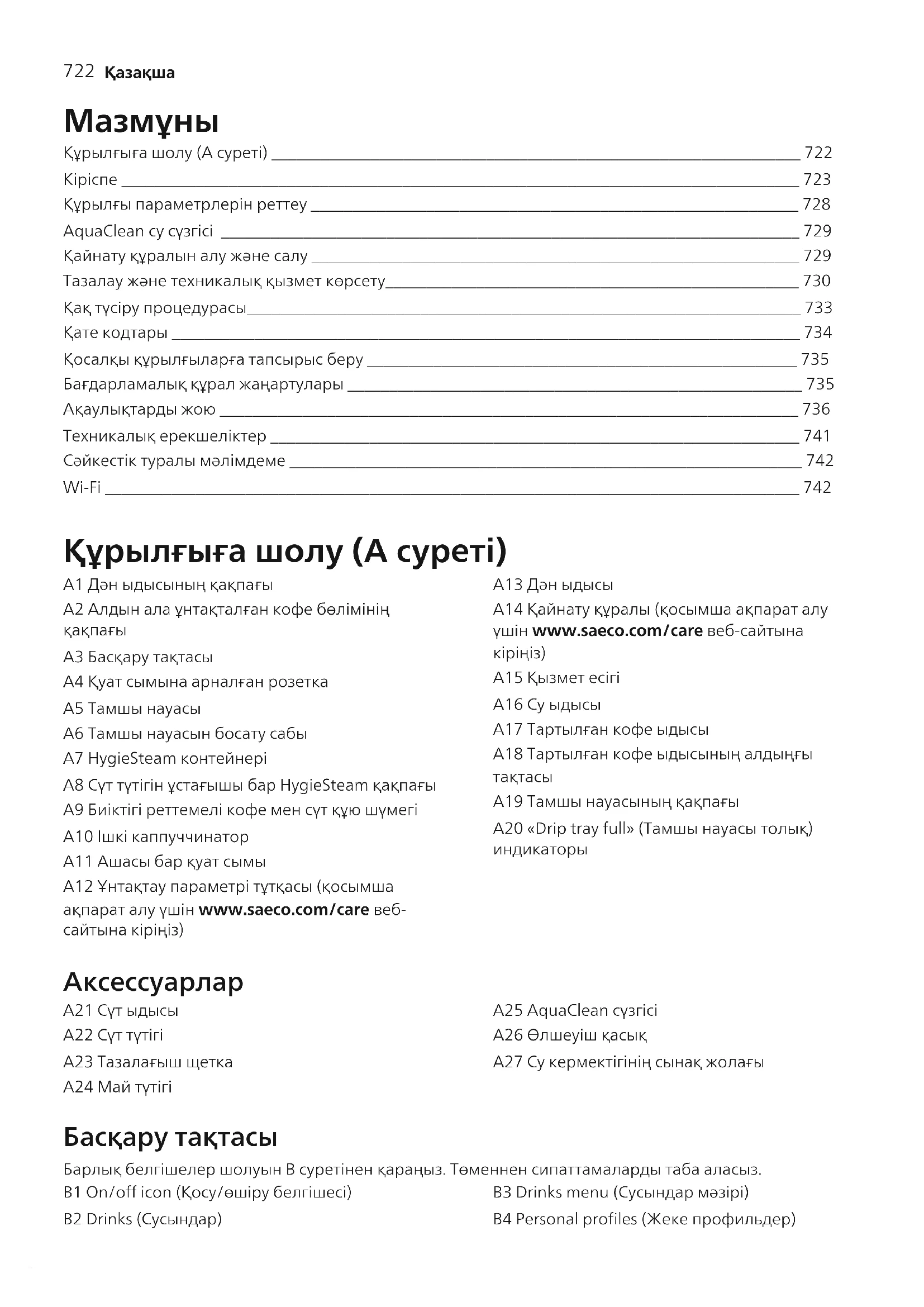 Құрылғыға шолу (A суреті) ________________________________________________________________ 722 Кіріспе __________________________________________________________________________________ 723 Құрылғы параметрлерін реттеу ___________________________________________________________ 728 AquaClean су сүзгісі ______________________________________________________________________ 729 Қайнату құралын алу және салу ___________________________________________________________ 729 Тазалау және техникалық қызмет көрсету__________________________________________________ 730 Қақ түсіру процедурасы___________________________________________________________________ 733 Қате кодтары ____________________________________________________________________________ 734 Қосалқы құрылғыларға тапсырыс беру ____________________________________________________ 735 Бағдарламалық құрал жаңартулары _______________________________________________________ 735 Ақаулықтарды жою ______________________________________________________________________ 736 Техникалық ерекшеліктер ________________________________________________________________ 741 Сәйкестік туралы мәлімдеме ______________________________________________________________ 742 Wi-Fi ____________________________________________________________________________________ 742 Құрылғыға шолу (A суреті) A1 Дән ыдысының қақпағы A2 Алдын ала ұнтақталған кофе бөлімінің
