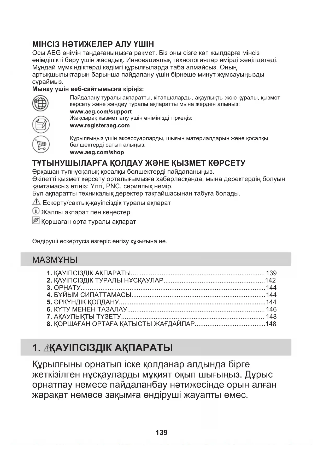 Riciclare i materiali con il simbolo . Buttare l'imballaggio negli appositi contenitori per il riciclaggio. Aiutare a proteggere l’ambiente e la salute umana e a riciclare rifiuti derivanti da apparecchiature elettriche ed elettroniche. Non smaltire le apparecchiature che riportano il simbolo insieme ai normali rifiuti domestici. Portare il prodotto al punto di riciclaggio più vicino o contattare il comune di residenza. 138МІНСІЗ НӘТИЖЕЛЕР АЛУ ҮШІН Осы AEG өнімін таңдағаныңызға рақмет. Біз оны сізге көп жылдарға мінсізөнімділікті беру үшін жасадық. Инновациялық технологиялар өмірді жеңілдетеді.Мұндай мүмкіндіктерді кәдімгі құрылғыларда таба алмайсыз. Оныңартықшылықтарын барынша пайдалану үшін бірнеше минут жұмсауыңыздысұраймыз.Мынау үшін веб-сайтымызға кіріңіз:Пайдалану туралы ақпаратты, кітапшаларды, ақаулықты жою құралы, қызметкөрсету және жөндеу туралы ақпаратты мына жерден алыңыз:www.aeg.com/supportЖақсырақ қызмет алу үшін өніміңізді тіркеңіз:www.registeraeg.comҚұрылғыңыз үшін аксессуарларды, шығын материалдарын және қосалқыбөлшектерді сатып алыңыз:www.aeg.com/shop ТҰТЫНУШЫЛАРҒА ҚОЛДАУ ЖӘНЕ ҚЫЗМЕТ КӨРСЕТУ Әрқашан түпнұсқалық қосалқы бөлшектерді пайдаланыңыз.Өкілетті қызмет көрсету орталығымызға хабарласқанда, мына деректердің болуынқамтамасыз етіңіз: Үлгі, PNC, сериялық нөмір.Бұл ақпаратты техникалық деректер тақтайшасынан табуға болады. Ескерту/сақтық-қауіпсіздік туралы ақпарат Жалпы ақпарат пен кеңестер Қоршаған орта туралы ақпаратӨндіруші ескертусіз өзгеріс енгізу құқығына ие.