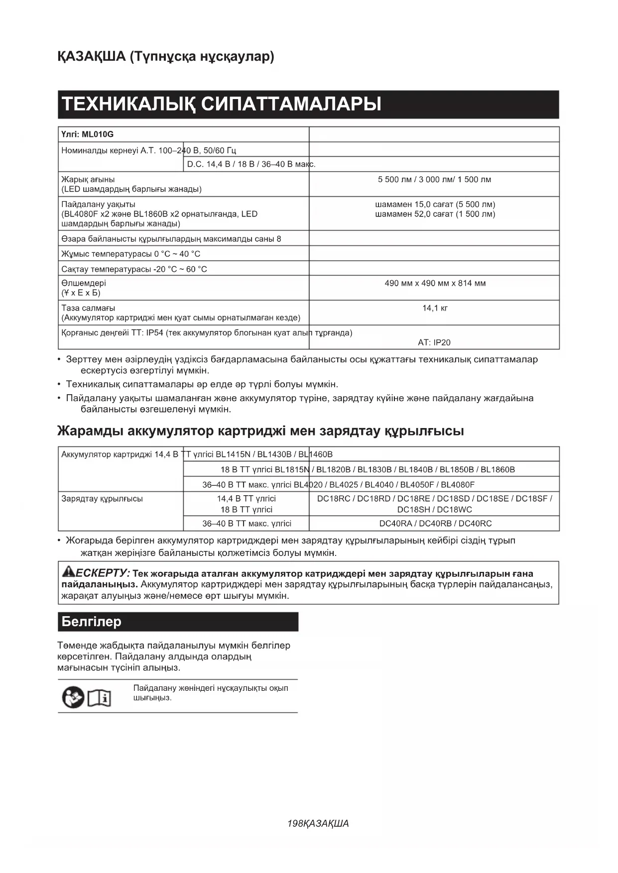- Оригинальный аккумулятор и зарядное устрой- ство Makita ПРИМЕЧАНИЕ: Некоторые элементы списка могут входить в комплект инструмента в качестве стандартных приспособлений. Они могут отли- чаться в зависимости от страны.198 ҚАЗАҚША ҚАЗАҚША (Түпнұсқа нұсқаулар) ТЕХНИКАЛЫҚ СИПАТТАМАЛАРЫ Үлгі: ML010G Номиналды кернеуі А.Т. 100–240 В, 50/60 Гц D.C. 14,4 В / 18 В / 36–40 В макс. Жарық ағыны (LED шамдардың барлығы жанады) 5 500 лм / 3 000 лм/ 1 500 лм Пайдалану уақыты (BL4080F x2 және BL1860B x2 орнатылғанда, LED шамдардың барлығы жанады) шамамен 15,0 сағат (5 500 лм) шамамен 52,0 сағат (1 500 лм) Өзара байланысты құрылғылардың максималды саны 8 Жұмыс температурасы 0 °C ~ 40 °C Сақтау температурасы -20 °C ~ 60 °C
